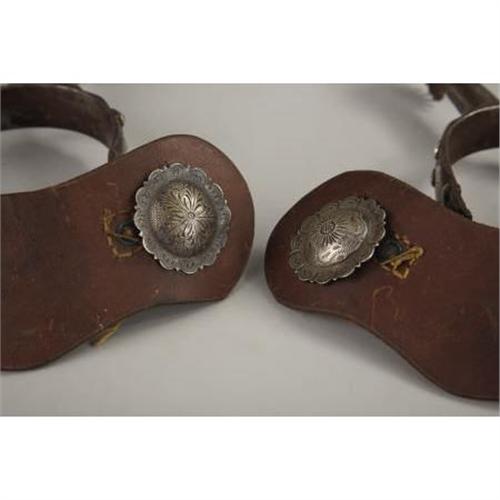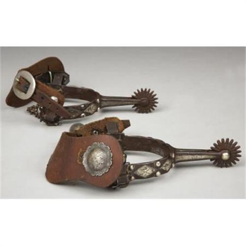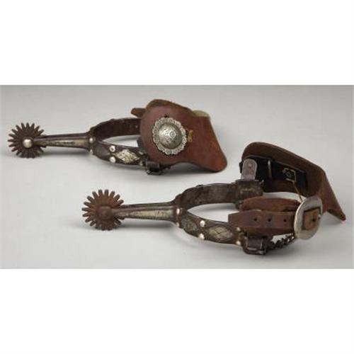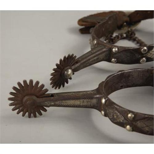 <B>UNMARKED STRAIGHT SHANK SPURS</B></I> - Attributed to Mike Morales. Double diamond inlay, full mounted, 2¾ shanks are mounted on 3 sides. ¾” bands have nickel studs top and bottom; swinging buttons and unusual chain loops.<BR><BR><B>Condition</B></I>: Some restoration to inlays with reinforcement pins added, surface rust overall.<BR><BR><b>Shipping:</b> Miscellaneous Collectibles, Larg (<a target="_blank" href="http://www.heritageauctions.com/common/shipping.php">view shipping information</a>)