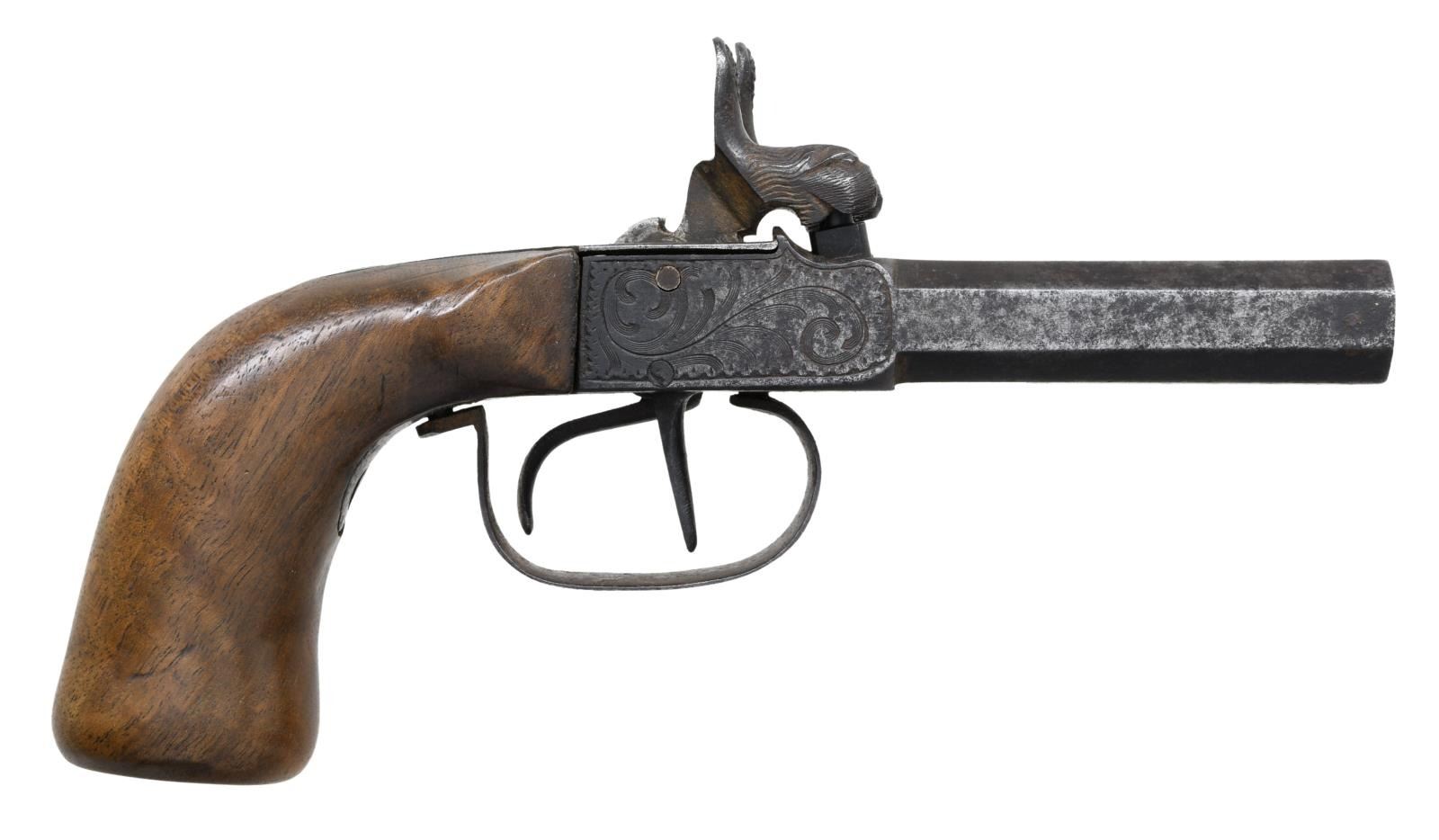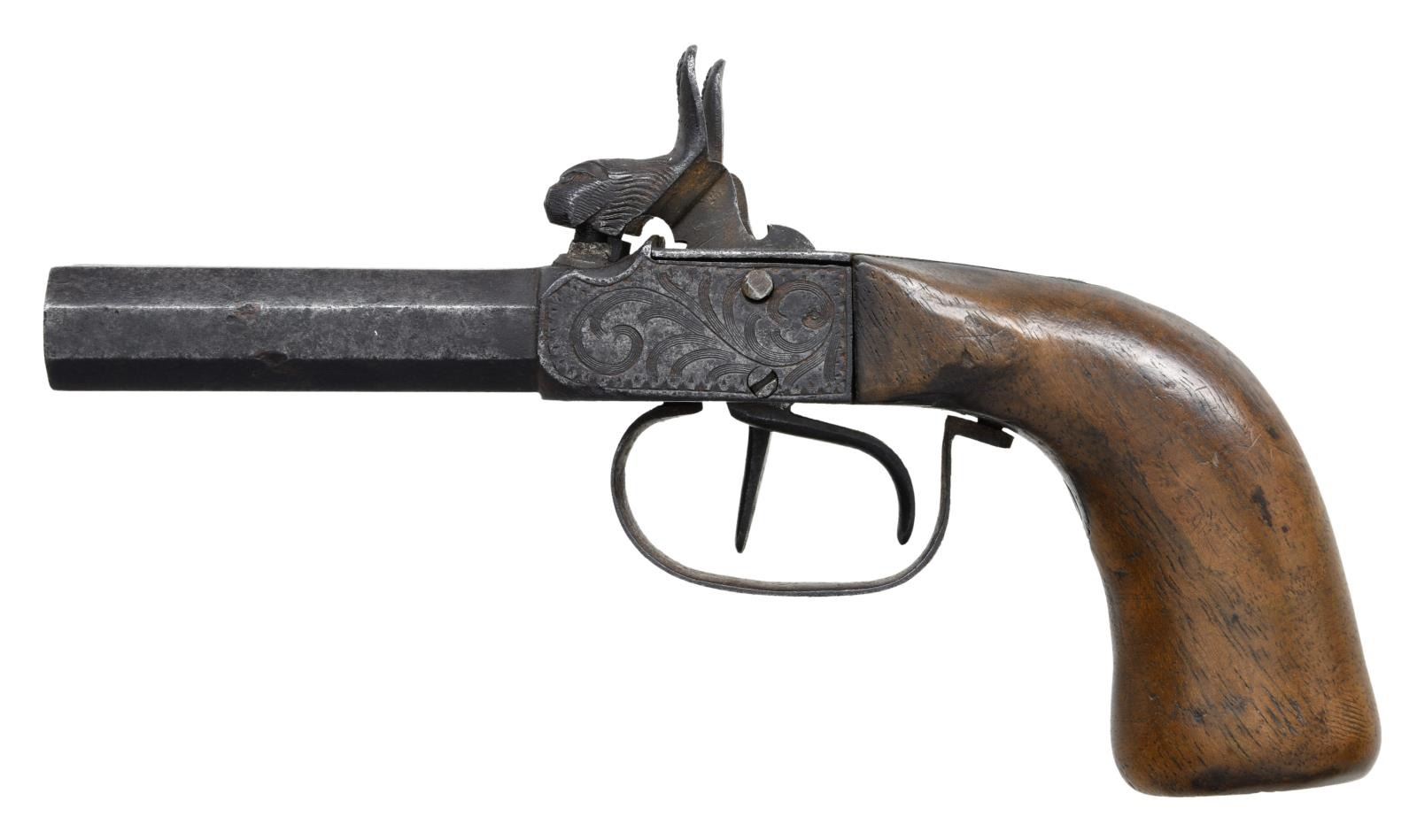 Cal. .45. S# NSN. Bbl 2 5/8". Frame, trigger guard, and top plate bear light scroll pattern engraving, but otherwise are unmarked and unproofed. Dogs head cocks. Smooth 1 piece wood grip. CONDITION: metal components retain a dark mottled gray patina overall, w/ some scattered spots of pitting. Grip shows some scattered handling marks, but is otherwise sturdy and serviceable. (01-23602/MLW). ANTIQUE. $300-400.