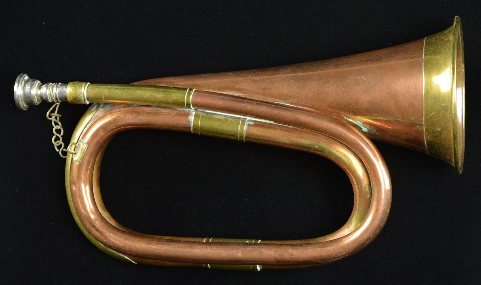 Overall: 11 1/2". Brass bugle has copper plating body. CONDITION: good overall appearance w/ sm. dents & verdigris along edges. Copper is flaking in areas. (02-19407/MD). $50-75.