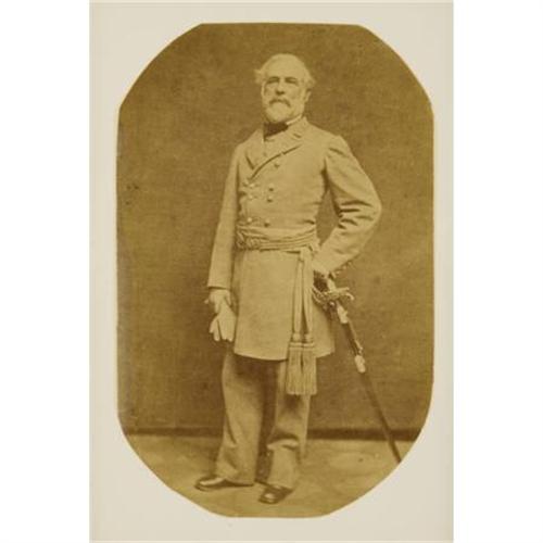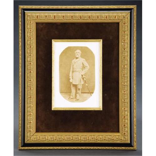 <B>UNMOUNTED ALBUMEN PHOTOGRAPH OF ROBERT E. LEE, 1863.</B></I> Robert E. Lee<I> </B></I>(1807-1870), American soldier, general in the Confederate States army, was the youngest son of Major General Henry Lee, called "Light Horse Harry." He was born at Stratford, Virginia, on January 19, 1807, and entered West Point in 1825. Graduating four years later, second in his class, he was given a commission in the U.S. Engineer Corps. In 1831 he married Mary, daughter of G. W. P. Custis, the adopted son of Washington and the grandson of Mrs. Washington. In 1836 he became first lieutenant and, in 1838, captain. In this rank he took part in the Mexican War, repeatedly winning distinction for conduct and bravery. He received the brevets of major for Cerro Gordo, lieut. colonel for Contreras-Churubusco and colonel for Chapultepec. This unmounted albumen image of General Robert E. Lee, taken in 1863, shows him proudly displaying his sword with his sash around his waist. He very seldom posed with these items in his photographs. Trimmed in oval shape, fashioned for cabinet card. 3.5” x 5.5”. <BR><BR><B>Condition:</B></I> Very good-fine condition.<BR><BR><b>Shipping:</b> Framed - without Glass, Small (<a target="_blank" href="http://www.heritageauctions.com/common/shipping.php">view shipping information</a>)