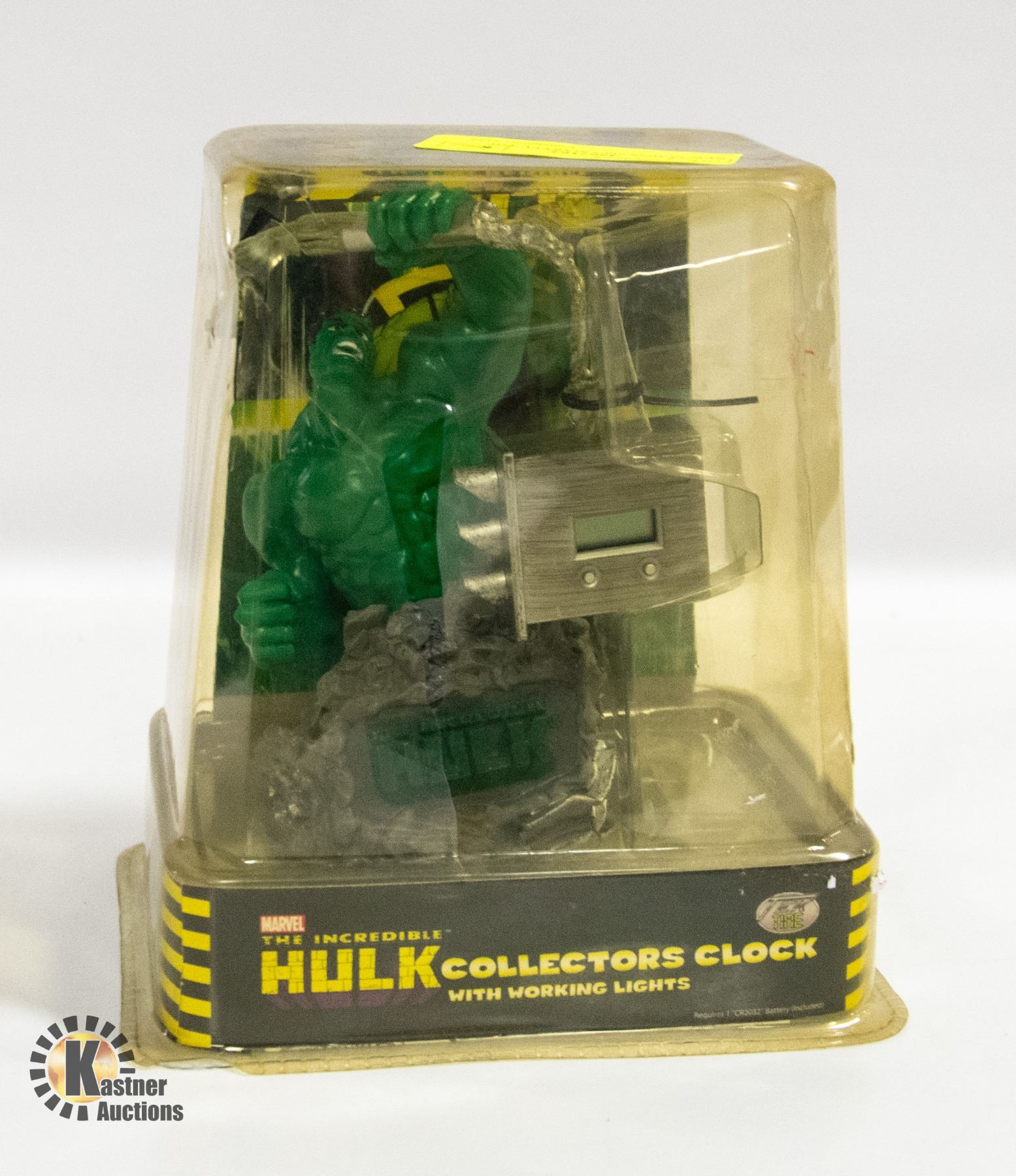 INCREDIBLE HULK COLLECTORS CLOCK WITH LIGHTS, PACKAGE HAS YELLOWED AND PACKAGE IS DAMAGED **ALL ITEMS MUST BE REMOVED BY 5PM SATURDAY, OCTOBER 12TH 2024. ALL REMAINING ITEMS WILL BE SUBJECT TO A $6.00 PER DAY STORAGE CHARGE. ANY ITEMS REMAINING AFTER MONDAY, OCTOBER 27TH 2024 WILL BE CONSIDERED FORFEITED. NO REFUNDS WILL BE ISSUED FOR FORFEITED ITEMS. TO SCHEDULE A PICK UP APPOINTMENT CLICK HERE