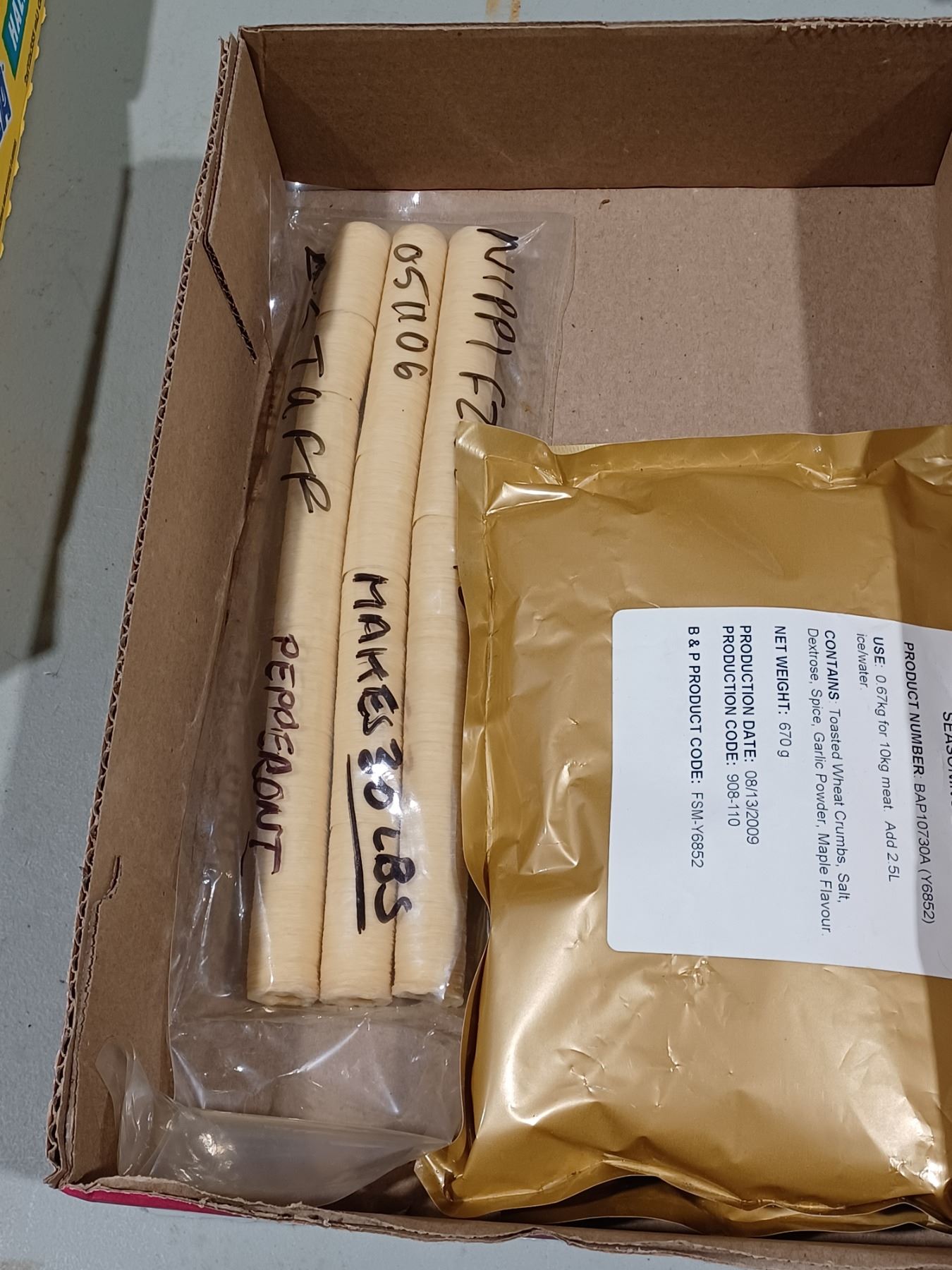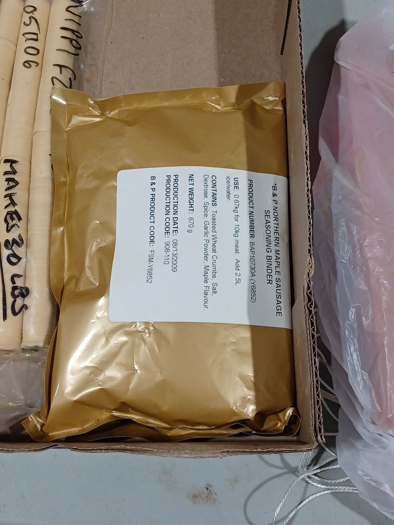 UNOPENED BUTCHERS & PACKERS MAPLE SAUSAGE MIX AND BINDER - MAKE 10KG AND COMES WITH CASINGS
