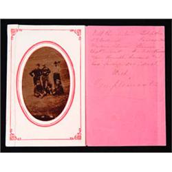 UNPUBLISHED TINTYPE OF GEORGE A. CUSTER, FOUR FRIENDS AND A DOG. Small tintype, 3-1/4" x 2-5/16" vertical image of the five men and a black and white dog. Custer, in uniform, is standing between two of the men with two others seated in the foreground on either side of the dog. Custer is wearing a cavalryman's felt hat and neckerchief with mid-calf high boots. The man to Custer’s own right is wearing a uniform jacket, and the other gentlemen are in civilian clothes. Accompanied by its original paper tri-fold with red and white cover and lavender backing. The right side is inscribed, apparently from Custer, "EW Chamberlain Toledo Ohio / DE Bostwick Jackson MI / Martin Lehman Francisco (MI) he only shows ditto marks / Chas Moderitt Blue Ridge Kansas / Your Humble Servant and / my favorite Dog "Dash" / With / Compliments". There is no signature, but given that four of the five subjects in the photograph are named it stands to reason that the photo was a gift from Custer. Accompanied by a letter from D. Mark Katz of the American Image Gallery, Bel Air, CA. wherein he states with absolute certainty that the image "is that of General George Armstrong Custer" and that it is a vintage period copy of another ferrotype "perhaps done in the field by an itinerant period photographer". He states that he would date the image as during the summer of 1874, at which time Custer was in the field with the 7th Cavalry in Dakota Territory on The Black Hills Expedition. He further states that "the pose and hat worn by Custer is similar to K-140, taken by Orlando S. Goff in July 1875". He further states that "this image is unique and --- one of a few copies that were made for the identified men." Mr. Katz also states that the handwriting in the note appears to be that of General Custer and that the dog is similar to others pictured with Custer. CONDITION: Image is fine. Slightly faded with oval markings around the edges from the presentation paper. Paper is very delicate with a small tear in one of the folds, but the writing is legible. 4-51556