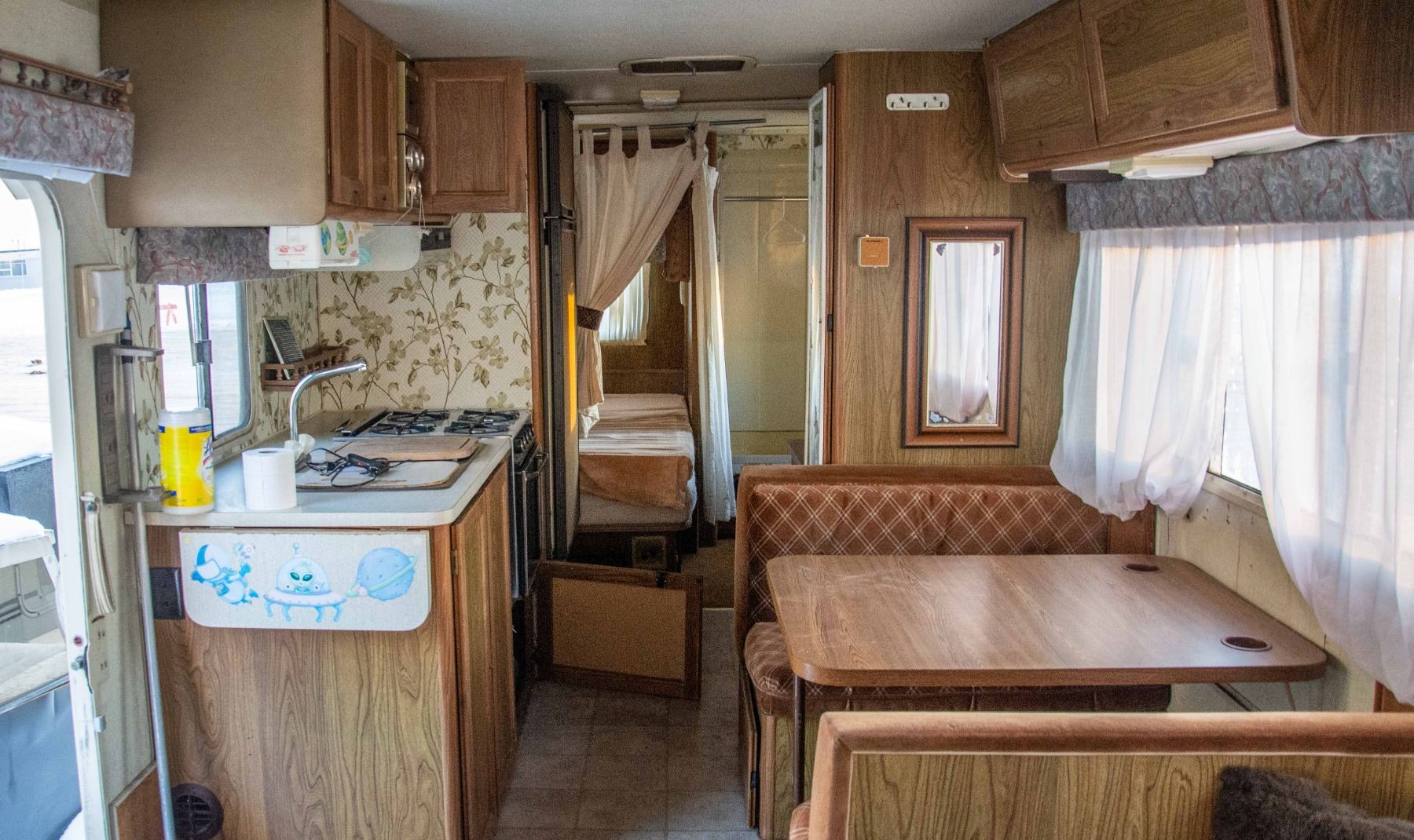 VEHICLE FEATURES NORMAL ACTIVE STATUS, HAS A CD PLAYER, PULL OUT COUCH, KITCHEN DINETTE, STOVE, OVEN, SINK, FRIDGE, DOUBLE SIZE BED, SHOWER, SINK, TOILET AND AWNING. WINDSHIELD IS CRACKED, VEHICLE DOES NOT TURN OVER.