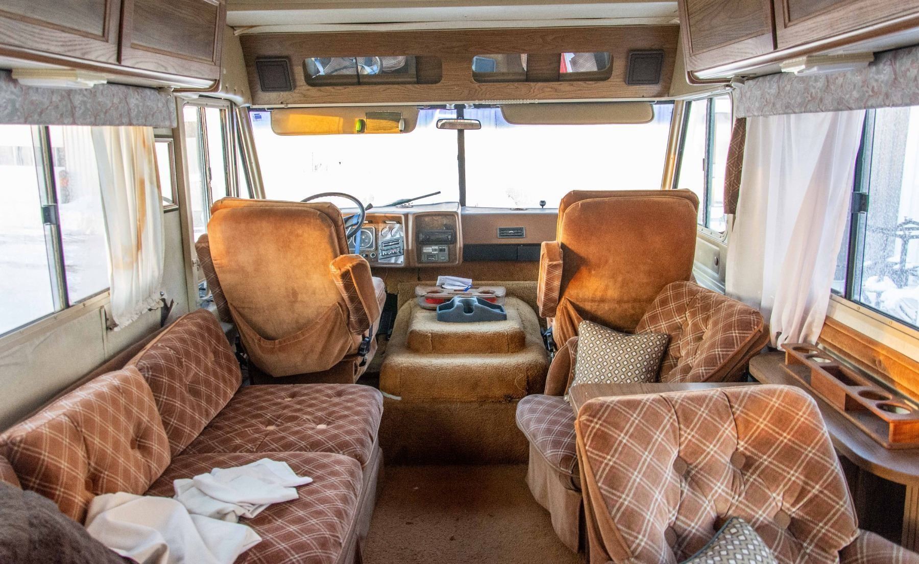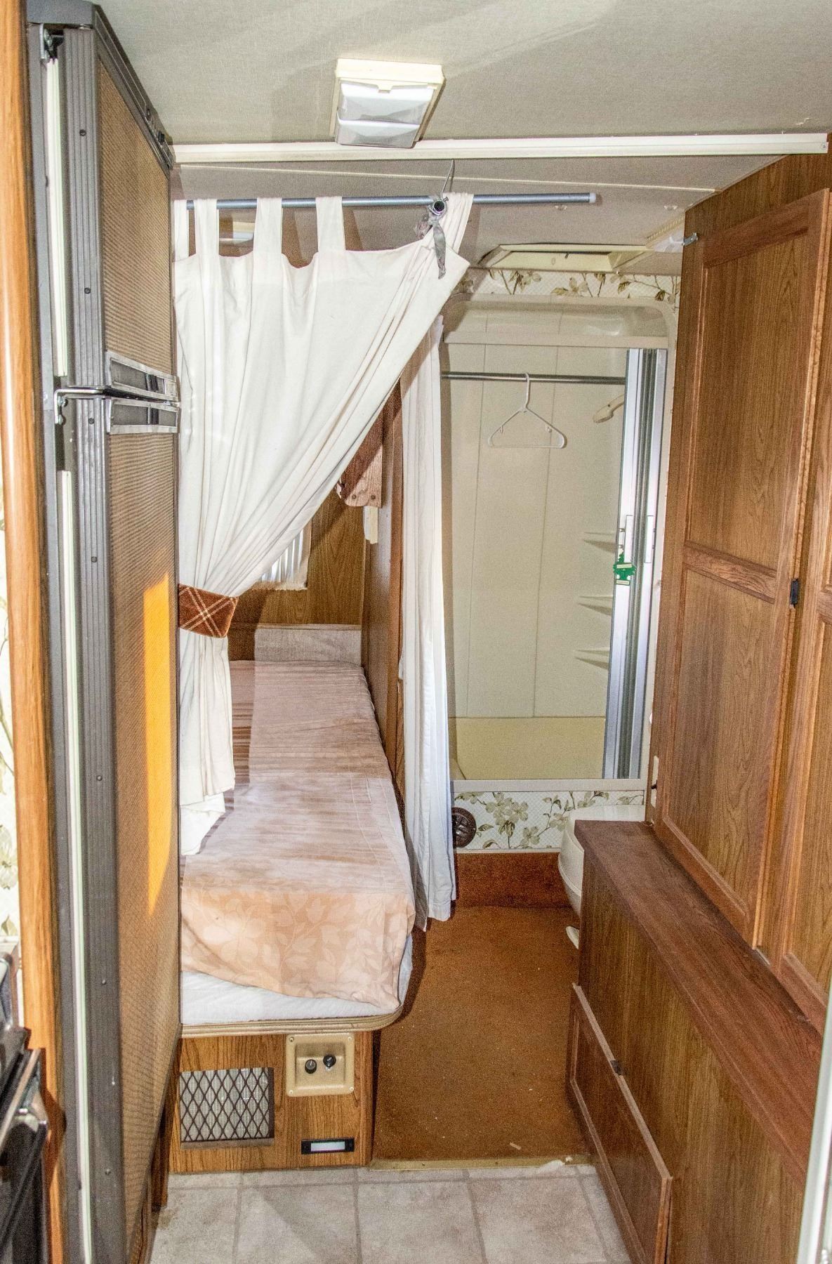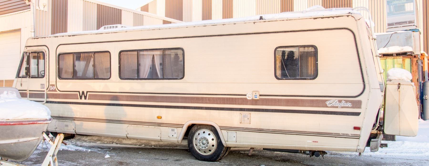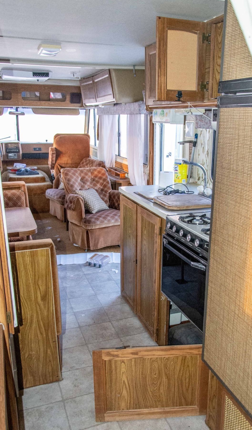 VEHICLE FEATURES NORMAL ACTIVE STATUS, HAS A CD PLAYER, PULL OUT COUCH, KITCHEN DINETTE, STOVE, OVEN, SINK, FRIDGE, DOUBLE SIZE BED, SHOWER, SINK, TOILET AND AWNING. WINDSHIELD IS CRACKED, VEHICLE DOES NOT TURN OVER.
