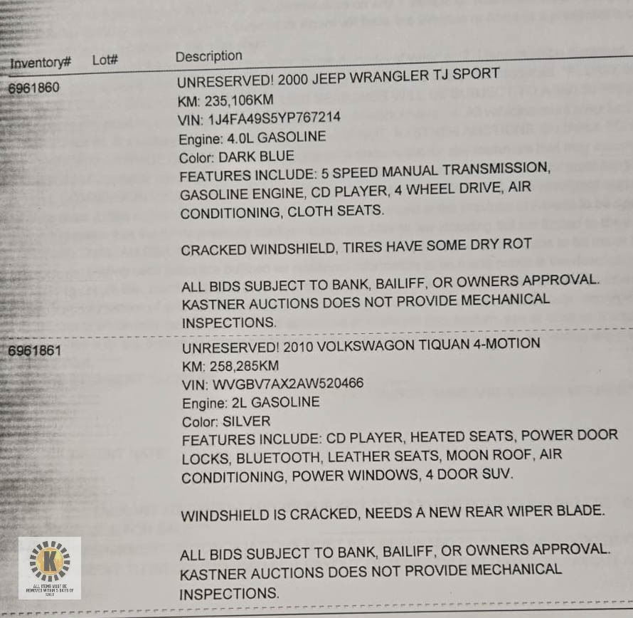 ALL BIDS ARE SUBJECT TO BANK, BAILIFF OR OWNER APPROVAL, ALL VEHICLES ARE SOLD AS IS, BUYERS PREMIUM IS 10% TO A MAXIMUM OF $750.00 KASTNER AUCTIONS DOES NOT PROVIDE MECHANICAL INSPECTIONS. **ALL ITEMS MUST BE REMOVED BY 5PM SATURDAY, APRIL 26TH 2025. ALL REMAINING ITEMS WILL BE SUBJECT TO A $6.00 PER DAY STORAGE CHARGE. ANY ITEMS REMAINING AFTER MONDAY, MAY 12TH 2025 WILL BE CONSIDERED FORFEITED. NO REFUNDS WILL BE ISSUED FOR FORFEITED ITEMS. TO SCHEDULE A PICK UP APPOINTMENT CLICK HERE