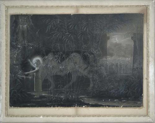 UNSIGNED (19th/20th Century) BULL AND BOY AT WELL. Charcoal with white on paper laid on canvas scene shows a large bull drinking from well with boy having switch in left hand. They stand under a large waterfall with star above which cascades toward well. A precession of people with torches is seen through opening in gate. Housed in a painted white antique frame with no stretcher. CANVAS SIZE: 18-1/2" x 26". CONDITION: Edges have damage and there are some spots where paper has lifted. 9-27664