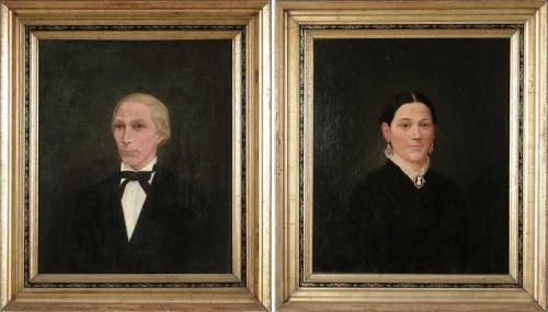 UNSIGNED (19th Century) PAIR OF ANCESTRAL PORTRAITS. Oil on canvas half portraits of a man and a woman reportedly the founders of Marshall Fields Dept. Store. The woman is seen in black dress with white lace collar. She wears an earring and brooch suite, which are white cameo portraits on black oval backgrounds set in yellow/gold setting. The man with black bowtie and black suit. Housed in an outstanding wide gilt and ebonized trim molded wood frame. SIZE: 25" x 30" each. CONDITION: Relined, very good. Restored with inpainting. 5-71779; 71780