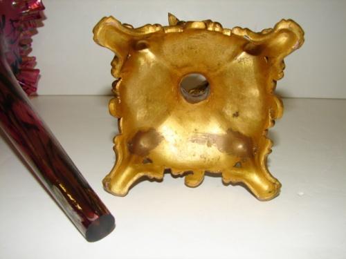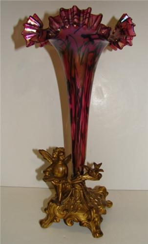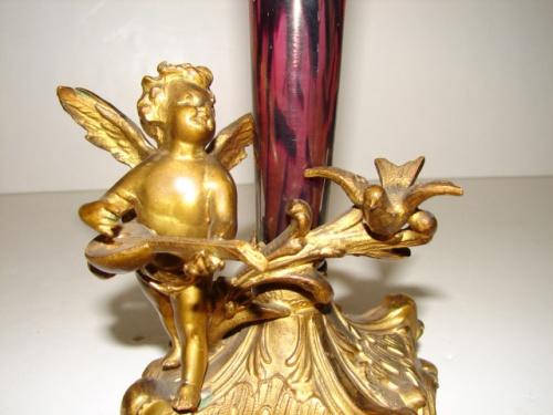 UNSIGNED AUSTRIAN ART GLASS TRUMPET VASE. Ruby glass. With ormolu bronze base with figural cherub with mandolin decoration. Excellent condition. 13.5” H