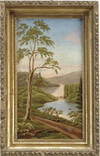 UNSIGNED (American, 19th/20th Century) VIEW FROM VAN BRYANTS HOME. Oil on board scene shows large river with trees and grassy banks looking across dirt road at a round lookout tower with window. Board has W. Devoe & Co., New York label. Pencil titled with location, which is illegible. Housed in an antique gesso decorated gilt frame. SIZE: 12" x 6-1/2". CONDITION: Some dirt, small pock mark at tower, otherwise good. 9-26510