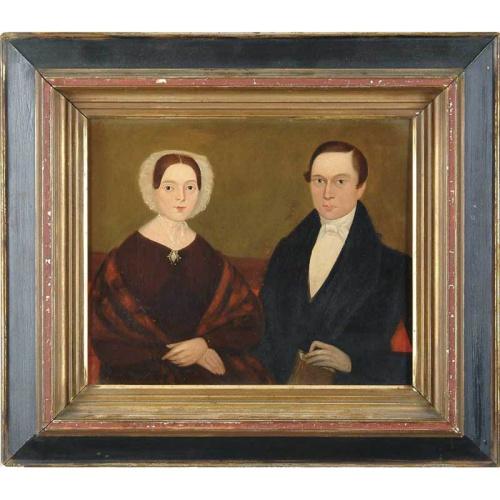 UNSIGNED (American, 19th Century) DOUBLE FOLK PORTRAIT. Outstanding oil on paper mounted on board folk art portrait shows a woman and man seated on red sofa having a greenish/brown background. The woman has a shawl around shoulders and wears a brownish/red dress. A lace bonnet is tied under her chin and she wears a golden pin on her collar. The man holds a book in his left hand and wears a formal black jacket with white shirt and bow tie. Unsigned. Housed in an old partial gilt black and red painted frame. SIZE: 10” x 12”. CONDITION: Very good. Untouched condition. 9-25789