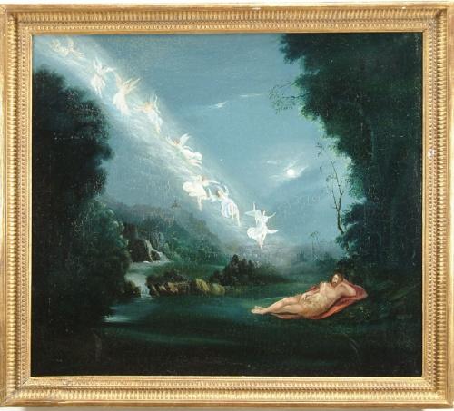 UNSIGNED (American, 19th Century) ""JACOBS DREAM"". Allegorical oil on canvas scene shows a man sleeping beside pool of water in a dream state with eight angels descending on a misty ray of light from the sky. The background is a moonlit tropical landscape with waterfalls, palm trees and cliffs. Housed in a fine gesso decorated wood frame. The canvas stamp ""Prepared by Edwd. Dechaux, New York"". The stretcher with old pen inscription ""Anne Hall Flushing, LI"". SIZE: 31-1/2in. x 36in.. CONDITION: Inpainting to craquelure, very good. 9-26469