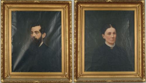 UNSIGNED (American, 19th Century) PAIR OF ANCESTRAL PORTRAITS. Oil on canvas, identically housed in nice gesso decorated period frames. The man with black beard and black coat against a dark background. The woman wearing dark dress with lace collar and pearl decorated hair pin against a dark background. SIZE: 27in. x 22in.. CONDITION: Unrestored. Woman has a 5in. tear in background. Man has small 1in. tear in head with some craquelure and scrapes. Fair to good. Frames are very nice. 9-26593