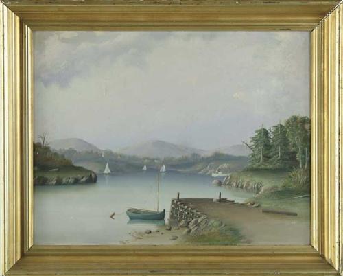 UNSIGNED (American, 19th Century) “THE LANDING AT SEBEC LAKE”. Oil on academy board primitive scene shows a wood post dock next to body of water which has three sailboats and side wheel steam boat flying blue and red flags. A small sailboat is moored and tethered to dock. The background has houses and church on hillside with mountains beyond. Title is written on top of frame. Housed in an antique lemon gold molded wood frame. SIZE: 18-1/2” x 24-1/2”. CONDITION: Some bow to board and crack in middle sky. Otherwise good. 9-27209