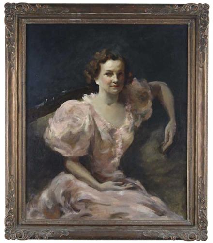 UNSIGNED (American, Early 20th Century) PORTRAIT OF YOUNG WOMAN. Oil on canvas Boston School portrait shows a young woman seated on sofa wearing a fancy pink dress. Unsigned. Housed in an antique bronzed colored carved wood frame. SIZE: 38" x 30". CONDITION: Craquelure. Appears to have old repainted areas. Very good. 9-27827