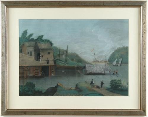 UNSIGNED (American, First half of the 19th Century) RIVER FERRY AND TOWN. Large pastel Hudson River type scene shows a large ferry manned by five men. One in blue outfit, the others in red and black, two holding guns. They are leaving a large dock area with two buildings, one being a post office. Two people are seen in large canoe, two people seen on shore, one fishing. A gap in the river shows a large town and church and farmhouse are seen on left bank. A two-mast sailboat is seen on right side of river. Unsigned. Nicely housed in a gilt carved wood frame with white matte. PROVENANCE: From a Gardiner, Maine home. SIGHT SIZE: 20in. x 28in.. CONDITION: Very good. 9-26014