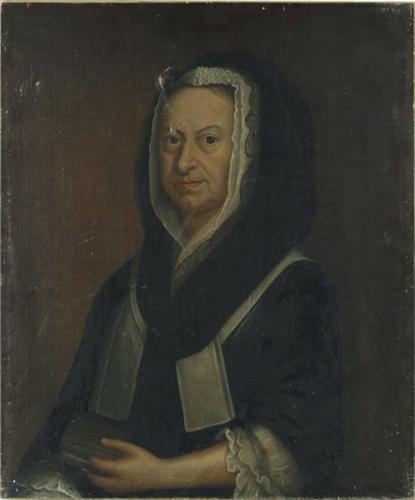 UNSIGNED (American, First half of the 19th Century) PORTRAIT OF A WOMAN HOLDING BOOK. Unframed oil on canvas portrait shows an older woman with black dress with a black lace edge head wrap over a white bonnet, which crosses below neckline. Her left hand holds open a book on her lap. A dark brownish background. SIZE: 30” x 25”. CONDITION: Relined, several scrapes with old restoration. Good. 9-27066