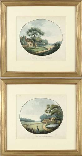 UNSIGNED (American, Late 18th Century) TWO VIEWS OF WINDSOR FOREST. Watercolor on paper oval scenes show houses with dirt road, people in landscape. Titles “A View on Windsor Forest” and “View on Windsor Forest”. One identified “New York 10 December 1793”. Other “N. York Nov. 28 1793”. Identically housed in modern gilt wood frames with ivory mattes. SIGHT SIZE: 12” x 13-1/2”. CONDITION: Very good, spot foxing to one. 9-27000