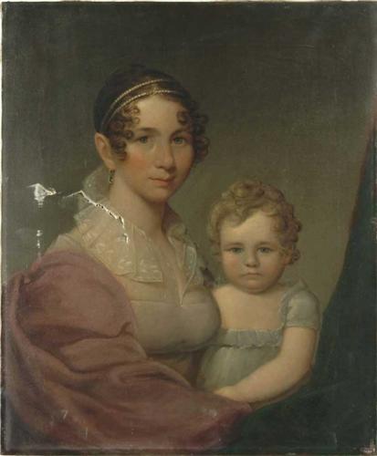 UNSIGNED (American, Mid-19th Century) PORTRAIT OF MOTHER AND CHILD. Outstanding unframed oil on canvas portrait shows half view of young woman seated holding a small child in lap. She wears a white lace dress with red cloth draped over her arm. The child wears a white dress and there is a draped green cloth on right side. Outstanding quality. PROVENANCE: Originally from a Philadelphia Estate. SIZE: 29” x 24”. CONDITION: Original canvas, large tear with scrape approximately 7” long, otherwise very good. 9-27056