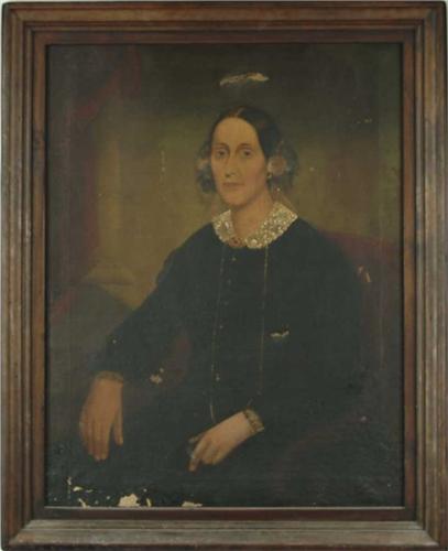 UNSIGNED (American, Mid 19th Century) PORTRAIT OF A WOMAN. Oil on canvas portrait shows a woman seated in an armchair with red upholstery. Behind her is a white column with red curtain. She wears flowers in hair, lace collar and sleeves. A long gold chain hangs from her neck and she wears three gold rings. Housed in a large molded wood frame. SIZE: 36” x 28”. CONDITION: Evidence of fire damage, alligatored and missing paint, tears. In need of restoration. 9-26932