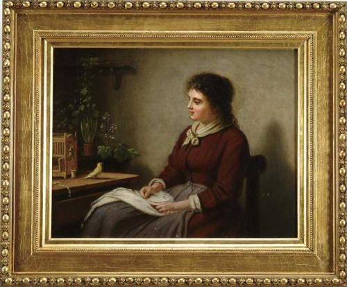 UNSIGNED (American School, Late 19th Century) GIRL WITH SONGBIRD. Nice oil on canvas interior scene shows a young woman seated in chair wearing red dress and purple apron. A small yellow bird stands atop one drawer stand next to birdcage with flowers behind. A nice pleasing composition. Housed in a regilt period gesso decorated frame. SIZE: 17-1/2" x 22-1/4". CONDITION: Very good. Minor inpainting. 9-26448