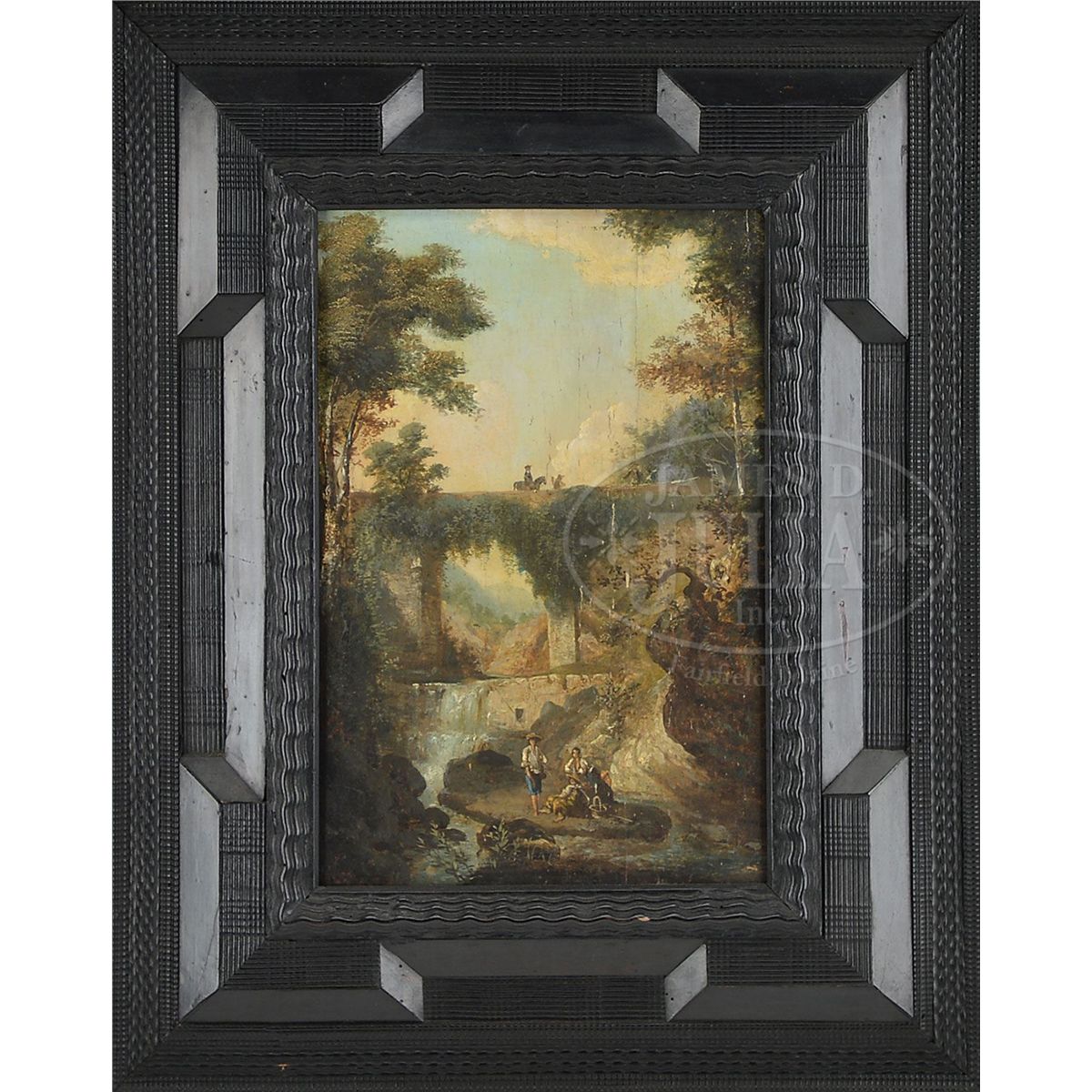 Oil on wood panel Housed in a very early ebonized carved wood frame SIZE: 16-1/2" X 12". Overall: 26-1/2" x 21". CONDITION: Some vertical chips along wood grain lines, some inpainting along frame edge. 9-29391