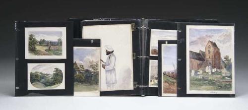 UNSIGNED (English, 19th Century) COLLECTION OF ENGLISH WATERCOLORS. The watercolors are housed in a notebook. Some are titled and some are dated 1859 – 1863. They include landscapes, interiors, buildings, flowers, churches and coastal scenes. 35 total. SIZES: Range from 3-1/2” x 6-1/2” to 7” x 10”. CONDITION: Generally very good. 4-55142