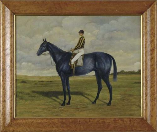 UNSIGNED (English, 20th Century) PORTRAIT OF A RACE HORSE. Oil on canvas scene shows a tall gray horse with jockey atop stands in green meadow with trees in background under a cloudy sky. Housed in a birdseye maple ogee frame. SIZE: 19-1/2” x 24”. CONDITION: Very good. 9-27616