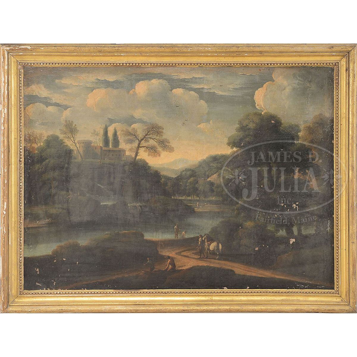 UNSIGNED (European, 19th Century) CLASSICAL LANDSCAPE WITH CASTLE, WATER & FIGURES