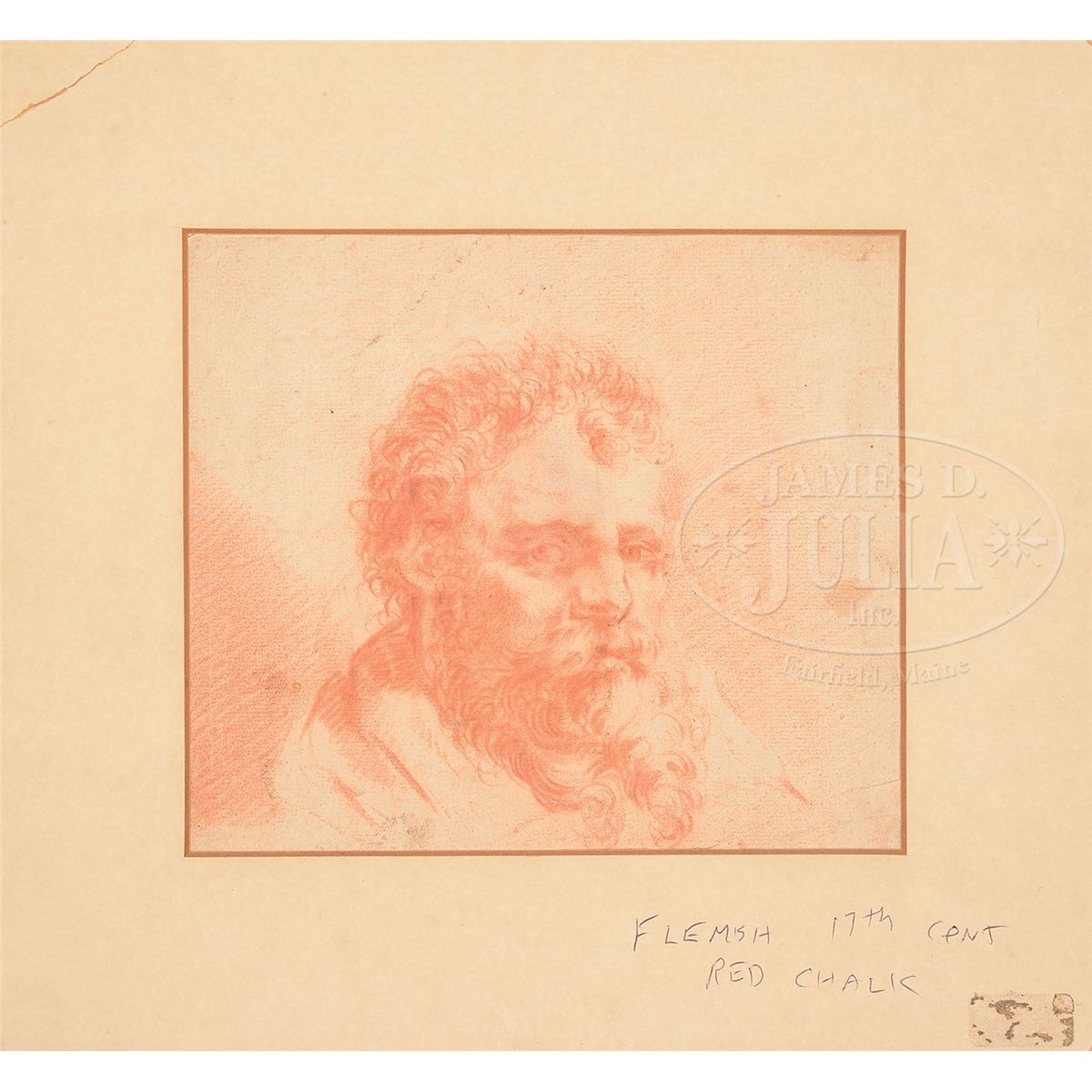 Red chalk on paper Housed in a hinged matte Unsigned SIZE: 6" x 7". Matte size: 10" x 10-3/4" PROVENANCE: A Montclair, NJ estate CONDITION: Surface dirt, at center forehead into eye is a back supporting patch - unknown as to whether there is retouching 9-28567