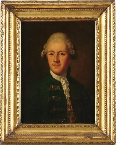 UNSIGNED (French, First half of the 19th Century) PORTRAIT OF AN ARISTOCRAT. Oil on canvas half portrait of a young man with white curly hair wearing a green jacket with gold buttons and trim. Old penned label on reverse ""Louis Francois Dreux du Redieve Housed in a good carved wood antique frame. SIZE: 14in. x 11-1/2in.. CONDITION: Restored. 9-26151