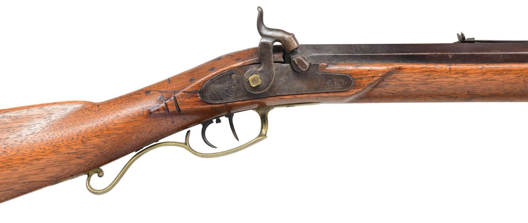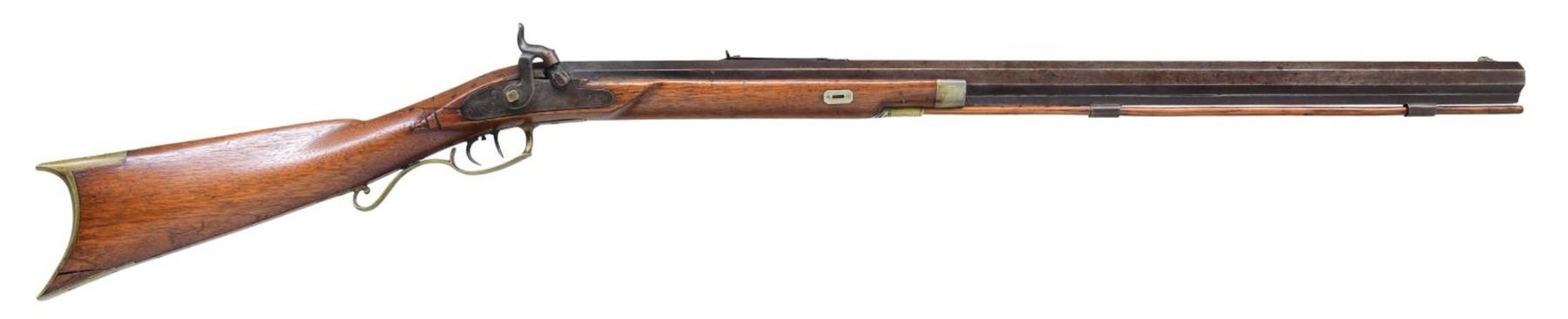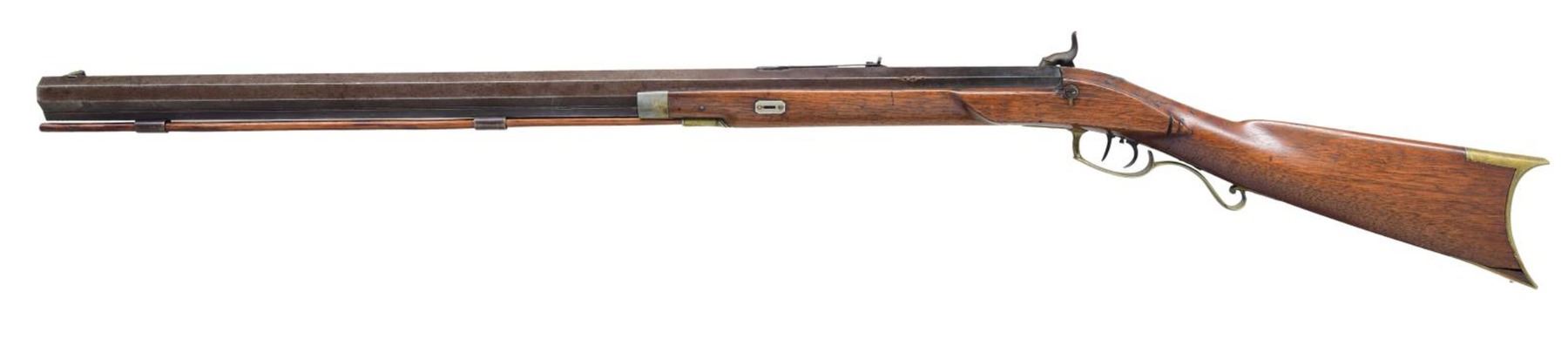 Cal. 42. NSN. The 31" octagonal barrel has a blade front sight and an elevator adj. rear sight. Bolster-style conversion with an altered hammer cup. Converted lock has floral engraving, partially obscuring the maker's mark. Dbl. set triggers; rear is set. Half-length wedge-fastened walnut stock with brass and German silver ornamentation. hardwood ramrod held on the underrib and two pipes. Set of two notches on both sides of the stock ears. UNATTACHED ACCESSORIES: brass tag 433. CONDITION: barrel and lock have a brown patina appearance with pitting, corrosion, and small impact marks. Sanded and refinished stock has a break through the wrist with 11 small plugs. Toe of the buttstock shows a break held by the buttplate and toeplate. Stock also shows scattered cracks. Bore shows strong rifling with scattered spots of pitting. (01-25357/MD). ANTIQUE. $400-600.
