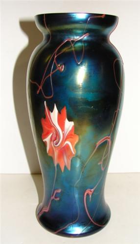 UNSIGNED LOETZ ART GLASS VASE. Purple iridescent glass. Red and white flower in body. Unsigned. Excellent condition. 9.75” H