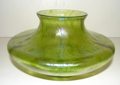 UNSIGNED LOETZ ART GLASS SQUAT VASE. Green oil spot glass. Unsigned. Excellent condition. 3.5” H