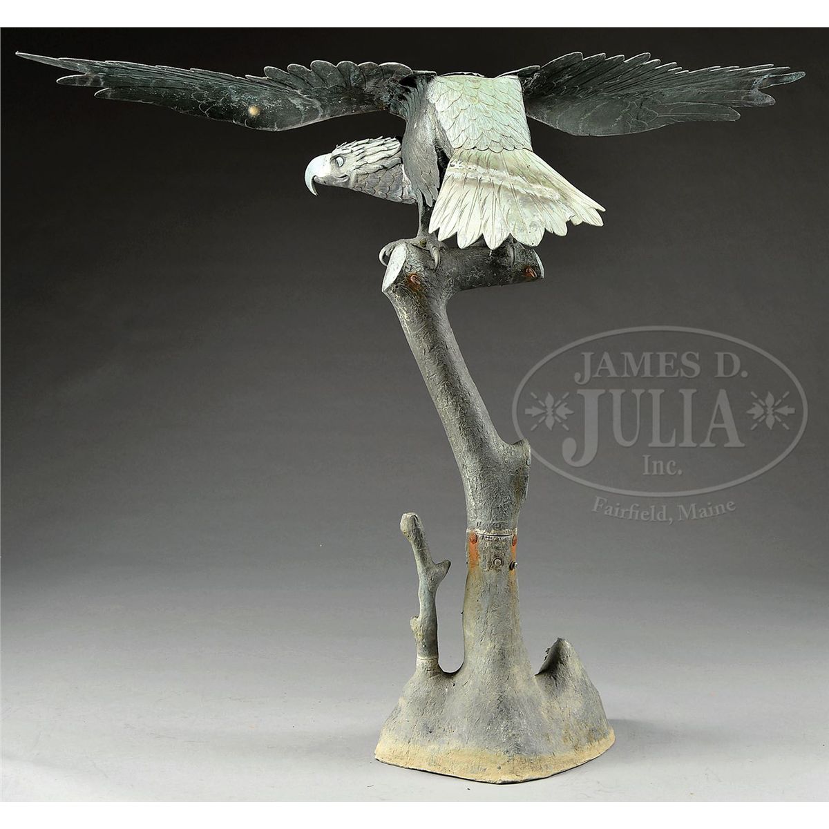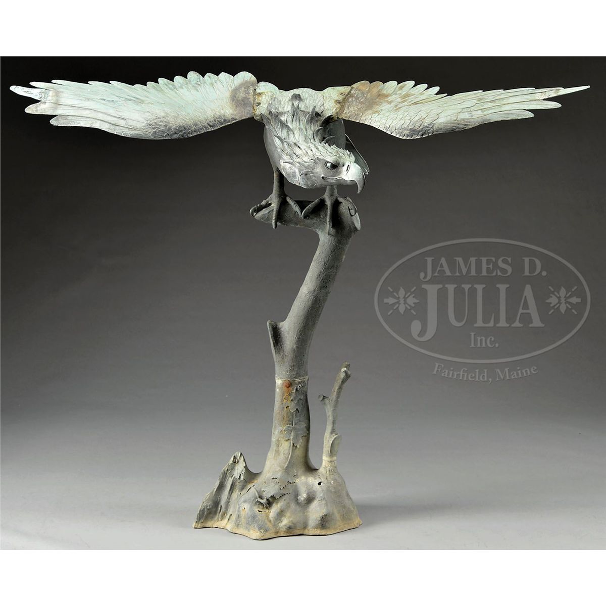 Bronze SIZE: 52-1/2" h x approx 42" d. Wingspan: 62". PROVENANCE: Collection and shop contents of Linda and the late Vito Peri (owners of the Blue Dolphin Antique Shop, Northport, Maine). CONDITION: Repairs to wings, holes in tree trunk, repaired tail, nice verdigris patina. 9-90095