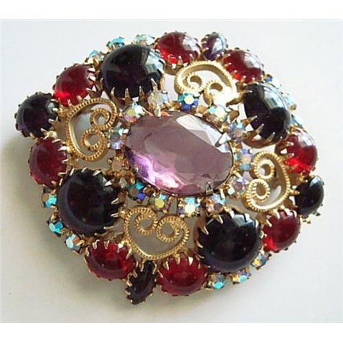 For sale I?m offering a fantastic and stunning designer unknown Brooch. In the middle is a purple faceted glass stone surrounded by aurora borealis stones. On the outside of the aurora borealis stones, you have Red and Black faceted glass stones with additional aurora borealis stones on the outside. Outstanding Brooch! It?s in mint condition. The back shows little to no goldtone wear. The back pin is in excellent condition and has working clasp that locks securely. There are no missing, discolored, loose or dead stones. All the stones are bright and shinny! Each stone is prong set. Don?t? let this beauty pass you up! Take advantage of my free shipping I?m offering at this time!