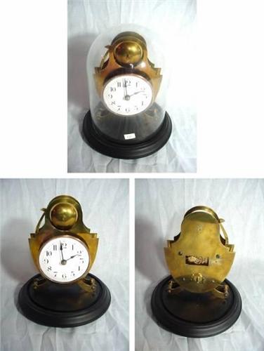 UNSIGNED TIME ONLY NOVELTY UNDER DOME; PLATFORM ESCAPEMENT WITH PASSING STRIKE; PLATES CUT IN SHIELD PATTERN; PLATFORM SIMILAR TO CHELSEA PRODUCTS OF THIS PERIOD BUT NO IDENTIFIABLE NAME; CIRCA 1920'S; 9" X 7.75", 7.75". VALUATION: 550-700 USD.