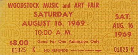 A great 1960s relic, an original ticket to the famed Woodstock Festival held Aug. 15-17, 1969, in Bethel, New York. The ticket was intended for sale at the gate, but the crowd had completely overwhelmed the promoters, who then deemed the event as a free concert and abandoned the use of tickets. Thus, the tickets never made it to the booths, but rather remained in safes throughout the festival site. This ticket is printed by the Globe Ticket Company in Woburn, Mass., numbered "01025 K", and imprinted in red with "Woodstock Music and Art Fair", good for admission Sat. Aug, 16, 1969. Fine condition.