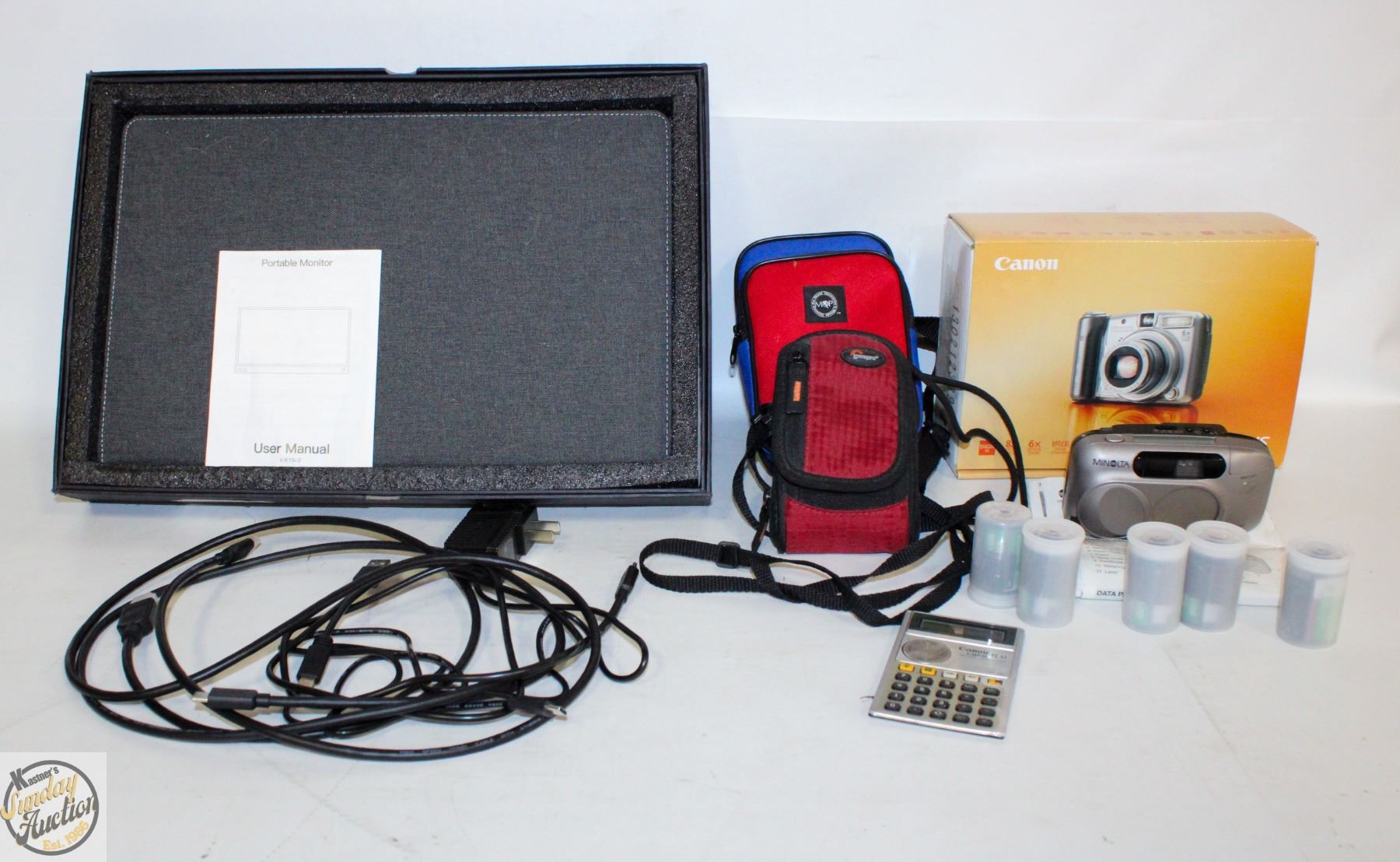 CAMERA IN BOX + MINOLTA CAMERA WITH EXTRAS ALL TOGETHER TESTED WORKING **ALL ITEMS MUST BE REMOVED BY 5PM SATURDAY, AUGUST 16TH 2025. ALL REMAINING ITEMS WILL BE SUBJECT TO A $6.00 PER DAY STORAGE CHARGE. ANY ITEMS REMAINING AFTER MONDAY, SEPTEMBER 1ST 2025 WILL BE CONSIDERED FORFEITED. NO REFUNDS WILL BE ISSUED FOR FORFEITED ITEMS. TO SCHEDULE A PICK UP APPOINTMENT CLICK HERE