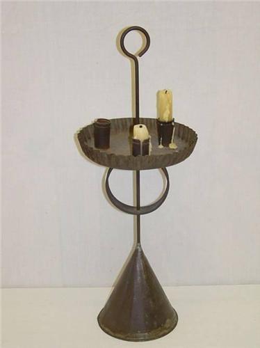 UNUSUAL 19TH CENT. TIN 3 CUP CANDLEABRA W/ WEIGHTED CONE SHAPED BASE and CRIMPED DRIP PAN - RESTORED;