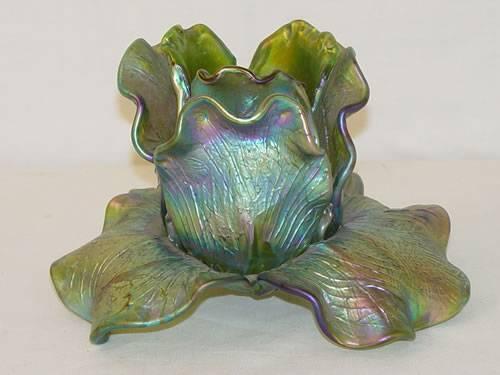 UNUSUAL 4 1/2" LOETZ TYPE GREEN IRIDESCENT IRIS BLOSSOM VASE, UNSIGNED;