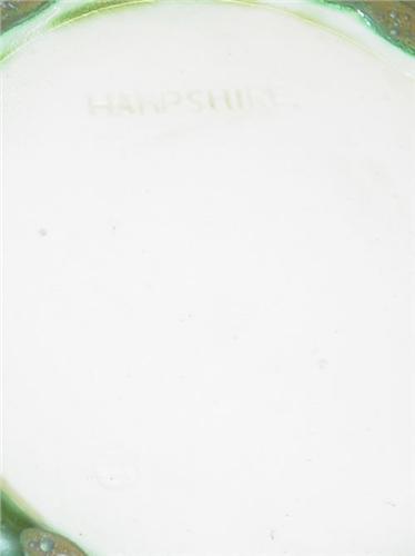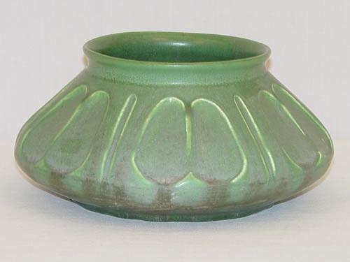 UNUSUAL 4" HAMPSHIRE POTTERY MATTE GREEN VASE- IMPRESSED LARGE DOUBLE THUMBPRINT & LINE DECORATION, MARKED IMPRESSED HAMPSHIRE ON BASE W/ "M" IN CIRCLE MAKERS MARK (ROBINSON) (4" T X 8" DIA.) - MINOR SCRATCHES