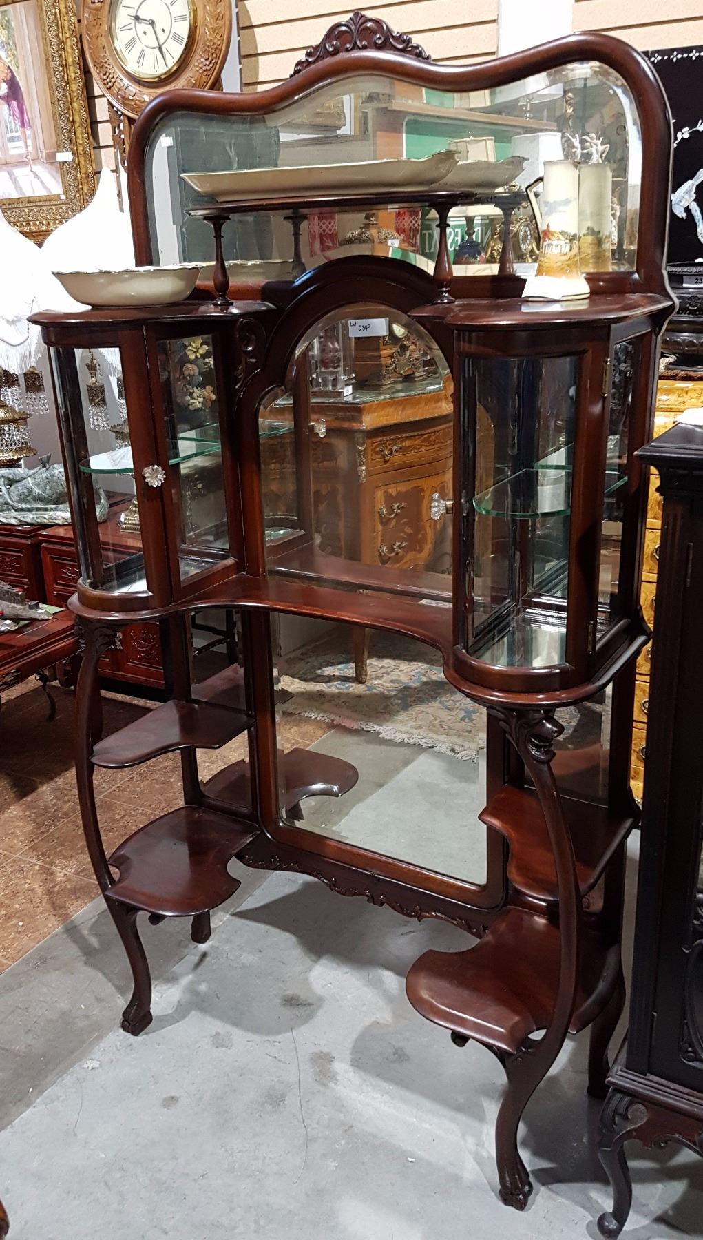 UNUSUAL CURVED GLASS WHATNOT STAND W/ADJUSTIBLE MIRROR