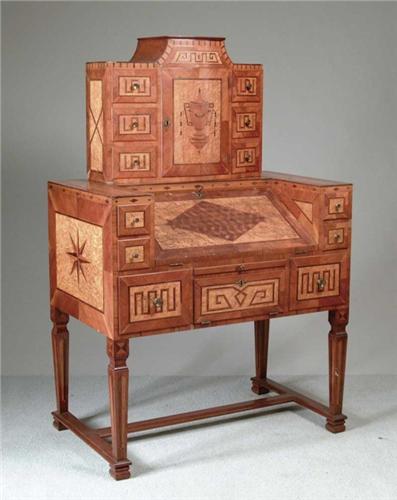 UNUSUAL FOLK ART MARQUETRY SLANT FRONT DESK. This unusual desk has elaborate and intricate marquetry inlays throughout. In one piece, having top back section with central bowed door with inlaid two handled urn. Interior fitted with one shelf. A central door flanked by three drawers on each side with geometric inlays. The drawers have an interior locking mechanism. The bottom section with inset fall front design which opens to a large open interior with geometric diamond pattern. The sides of this desk area have two shelves each, again, opened by an interior latch. The desk lid inlaid with eye dazzling block pattern. Underneath is a slide out checkerboard game board slide. Fall front small door and two drawers. All resting on four shaped tapering square legs ending in an H-shaped base. Various wood inlays with birdseye maple panels. SIZE: 59-1/2” h x 38-1/2” w x 23” d. CONDITION: Some veneer damage at base of top section, good. 5-71758
