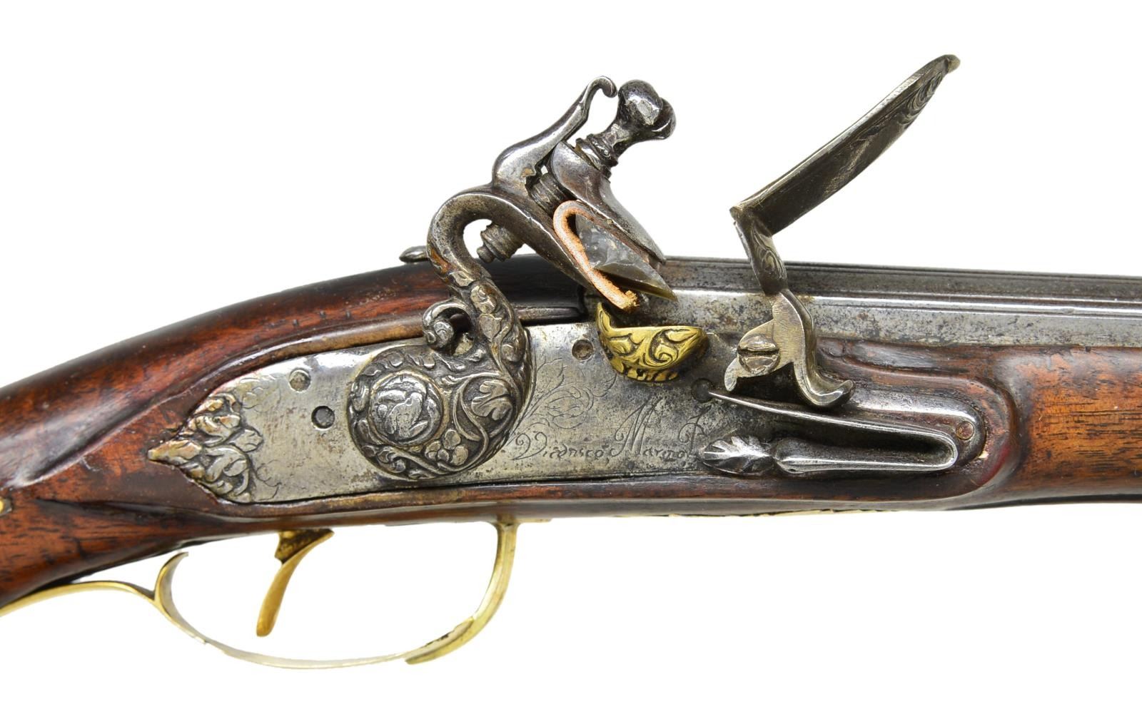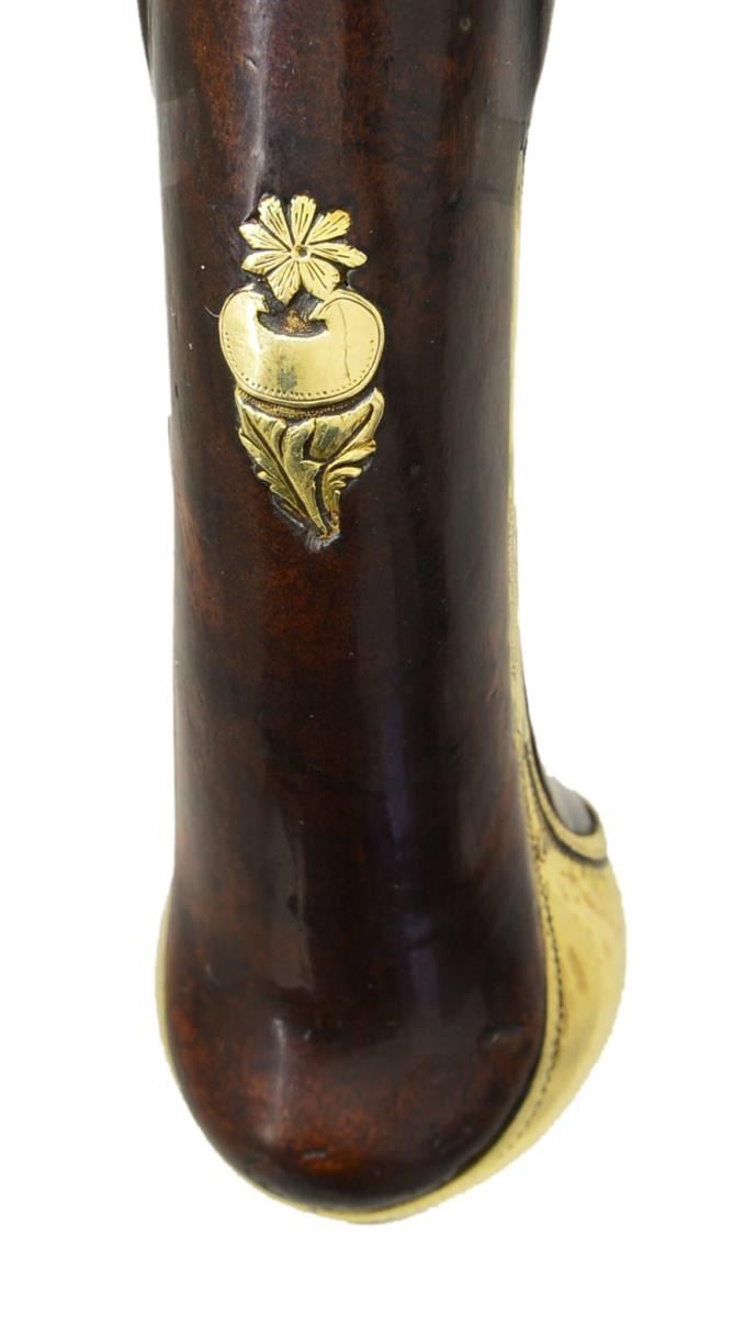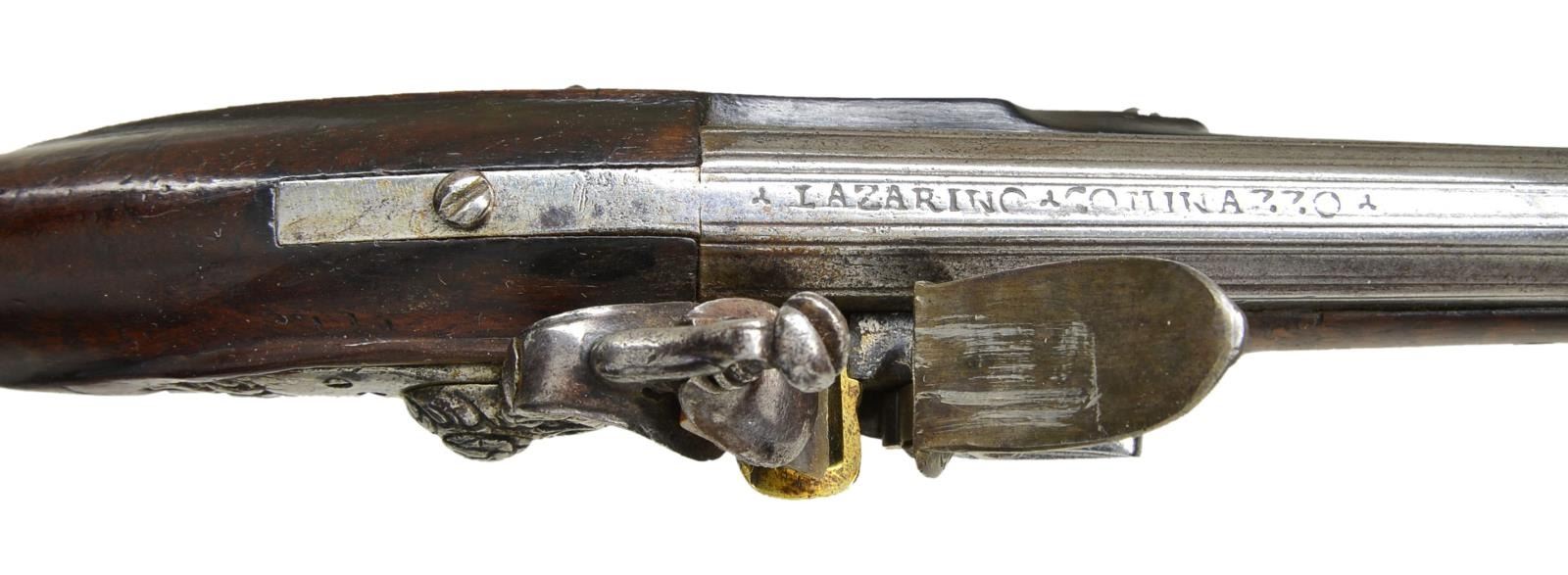 VINCENZO MARIANO OF BRESCIA WITH BARREL MARKED LAZARINO COMINAZZO. Cal. 50. NSN. Bbl. 11 3/4" oct. to rnd., w/ incised lines either side of octagonal points, has maker's name on top flat. Very early flintlock w/ arched rounded plate has unbridled tumbler & frizzen. Feather spring has nicely filed finial. The serpentine cock & tail of lockplate are deeply chased w/ scrolling vines & acanthus. Inset pan also w/ relief engraving is of solid gold. Area under pan has some light scroll engraving along w/ "Vicensco Mariano B." (which is probably Brescia, cannot be read because it is under feather spring finial). Walnut stock is pinned to bbl. & extends to muzzle & has relief carved false ramrod, thimble & tailpipe. Remainder of pistol is mounted in what appears to be solid gold (not tested) w/ bulbous spurred grip cap w/ dbl. boss; serpentine sideplate relief engraved w/ dragon's head & tail; trigger plate & trigger guard which has fancy engraved pinecone finial. The letter "C" stamped on flared bow. Top of grip is inlet w/ relief gold device of leaves, flower, & crescent moon. CONDITION: very good. Iron parts cleaned to silver/gray w/ some light pitting. Stock, most likely a very old replacement, has a coat of newer varnish & appears to be sound w/ few chips or losses. Gold remains bright w/ little wear. There is a repair to the rear portion of trigger guard bow. Lock is operable. "Heer Der Neue Stockel” lists Vincenzo Mari (ano) working in Brescia between 1680 & 1700. PROVENANCE: The Estate Collection of Gary Parietti. (01-19051/MGM). ANTIQUE. $2,500-3,500.