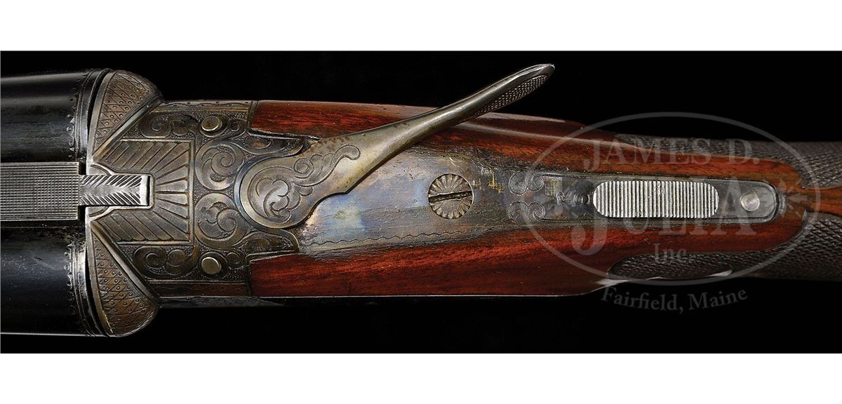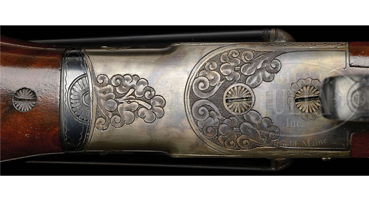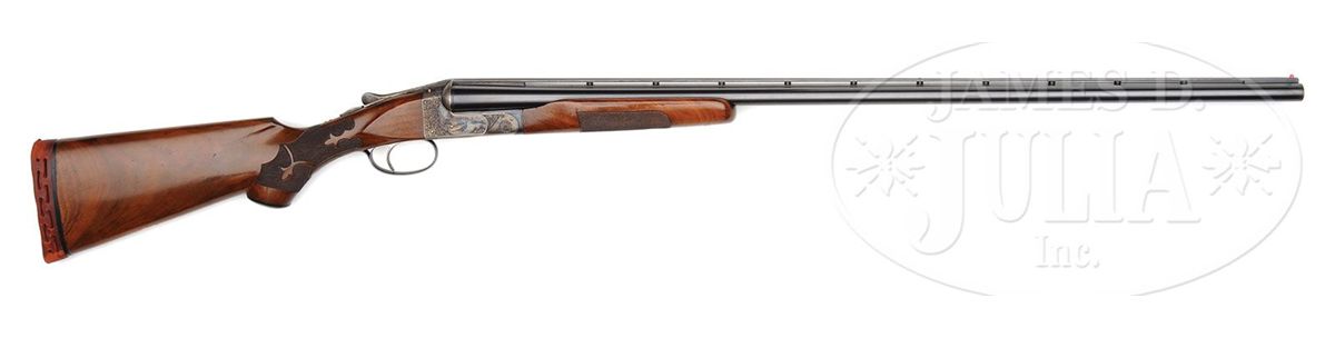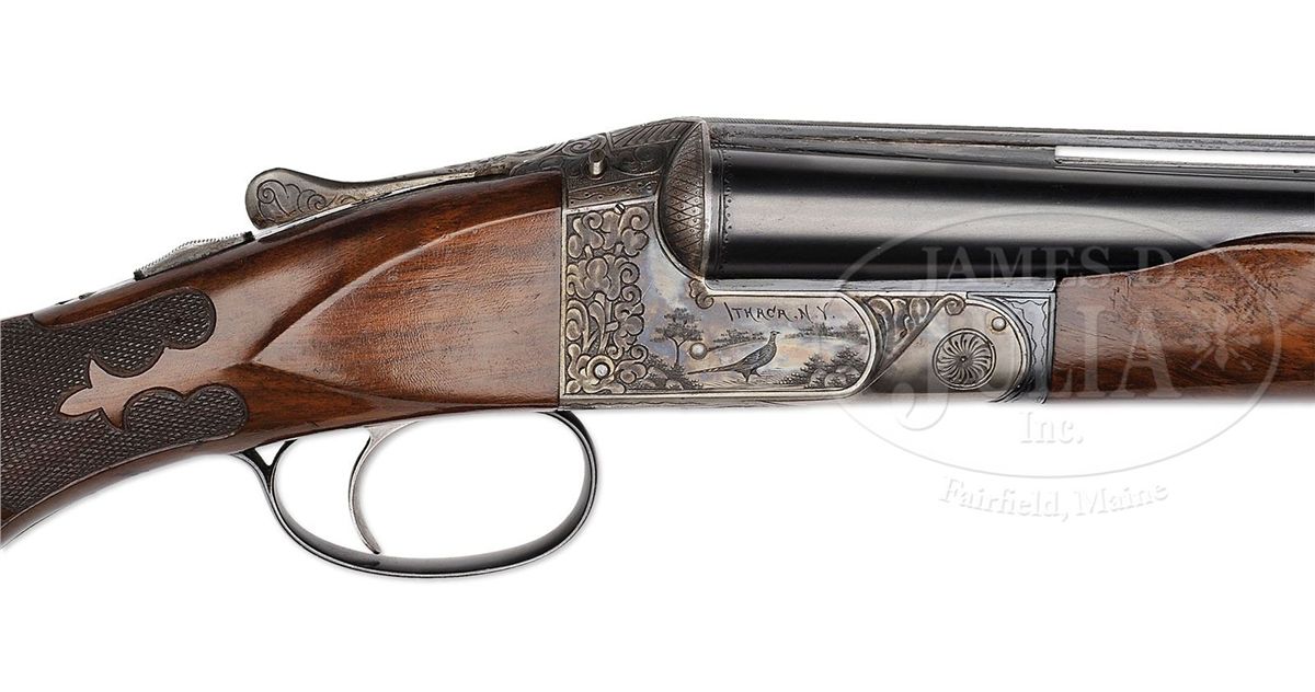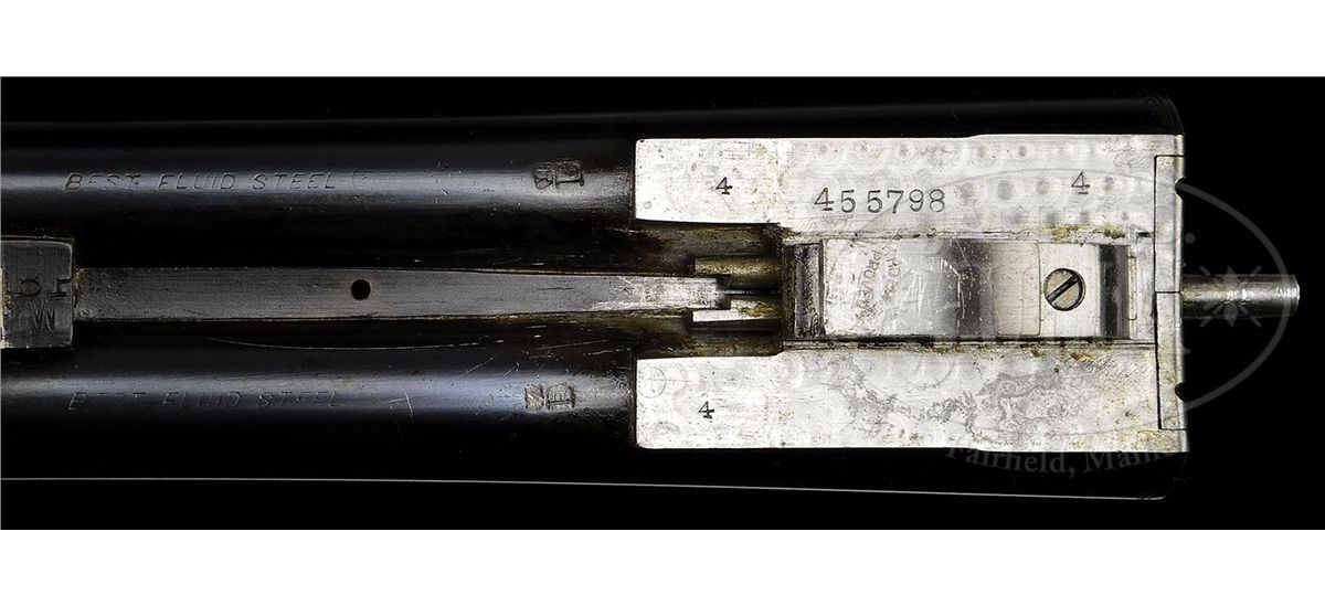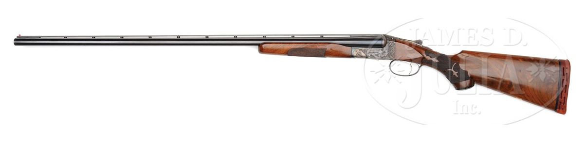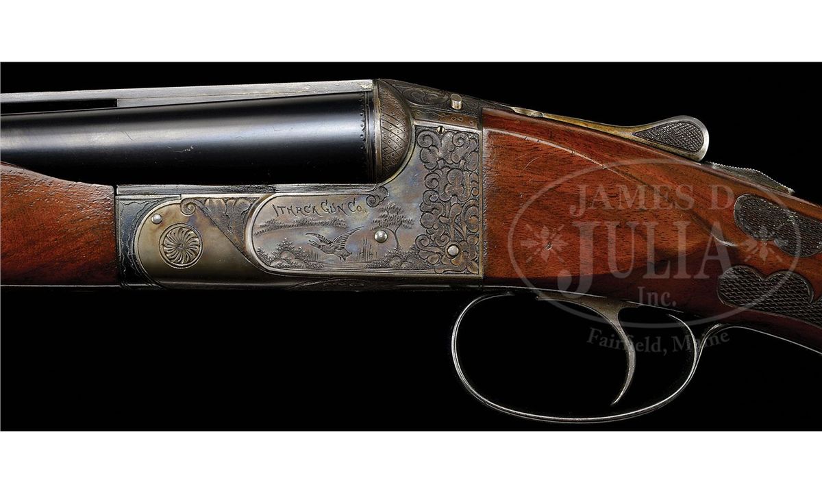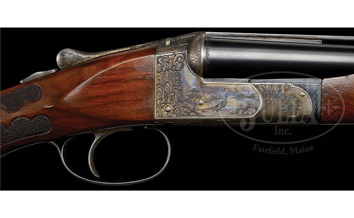 SN 455798. Cal. 20 ga. 2-3/4" Chambers. Rare 32" bbls with raised, matted, ventilated rib mounted with two red beads, are stamped with SN and grade on engine turned bbl flats. Bottoms of bbls are stamped with "BEST FLUID STEEL". Case hardened NID action with pin type cocking indicators, is fitted with Miller single selective trigger with selector on tang. Action is engraved in standard "4" style, with shaded acanthus scroll, highlighting duck and pheasant in appropriate backgrounds on either side of action, surmounted by "Ithaca Gun Co" and "Ithaca N. Y." Shaded acanthus is on bottom of action and front of trigger plate, as well as on bow of trigger guard which has SN at grip. Nicely figured American walnut capped pistol grip buttstock measures 13-1/2" over old, most likely original, "Jostam" open sided red pad. Checkering with fancy borders is pierced by fleur-di-lis and ribbons. Matching, short, fat, beavertail, ejector forend has inset ebony tip, reinforcing bolt, and Deeley type release. Bore diameter: left-.622, right -.617. Bore restrictions: left -.034 (Full), right -.025 (I Mod). Wall thickness: left -.032, right -.034. Drop at heel: 2-5/16", drop at comb: 1-1/2". Weight: 7 lbs. 5 oz. LOP: 13-1/2". CONDITION: Exceptionally fine. Bbls retain approx 98% orig blue, with a few light marks and scratches. Action retains over 95% of its orig case hardening color, just thinned slightly around bottom, with some silvering on fences, top lever, and tang. Trigger guard retains over 90% of its orig bright blue, slightly silvered on bow. Stocks retain nearly all of their orig varnish finish with a number of light marks and scratches. Checkering darkened, but with minimal wear. Bores are excellent, bright and shiny throughout. Engine turning of bbl flats and breech end of bbls is bright. Action is tight. Ejectors are slightly out of time. Trigger works. Only 560 4E NID's were made. Guns in this particular configuration, in 20 ga., with the unusual 32" bbls, can only be a handful. 4-48867 MGM156