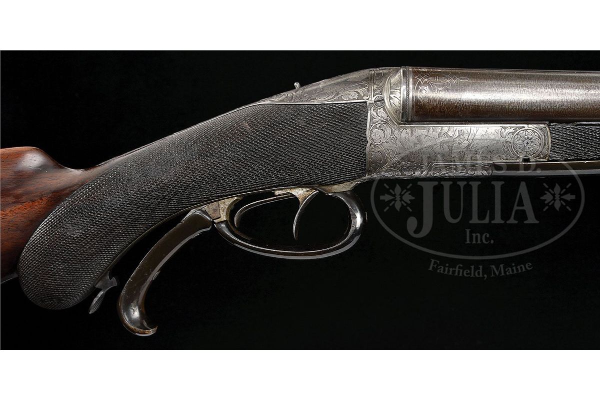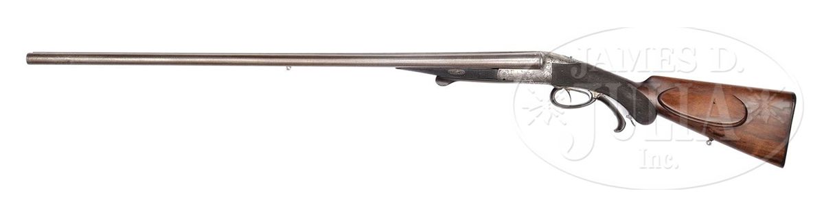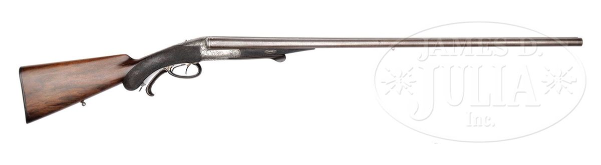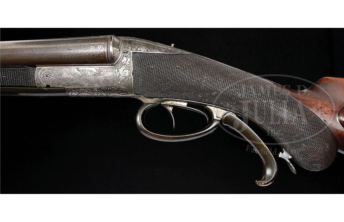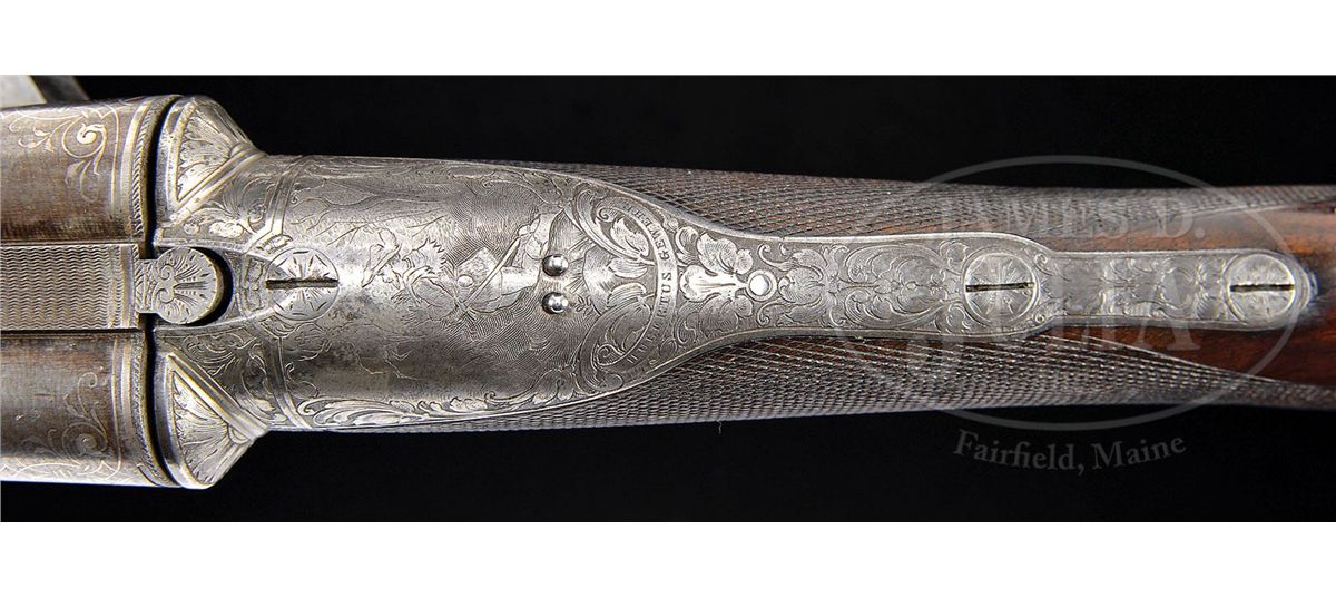 SN 911. Cal. 16 ga. 2-1/2" Chambers. 31-1/2" Fine Damascus bbls are silver inlaid "K. Bader in Oschersleben" on matted, concave game rib. Silver bands are inlaid at breech ends surmounted by fine scroll and geometric silver inlays. Bbl flats are stamped with imperial German black powder proofs, bottom of left bbl with SN. Horn covered forward lever, Jones type double lug action, features unusual Hubertus hammerless system with grip type safety for cocking. Pin type cocking indicators are on top of action. Cocking/ safety lever is held by detent at rear. Trigger plate is stamped with imperial eagle and "DRP 7812" (?). Action is very finely engraved with large, open, shaded, scrolled acanthus outlining vignettes of hunting dogs on left, and family group of roe deer on right. Top of action depicts scene of St. Hubertus and his stag. "Hubertus Gewehr" is in arched riband under scene. Lightly streaked European walnut round knob semi-pistol grip buttstock measures 14" over checkered horn buttplate, and features a right hand shadow line cheekpiece, and nearly full coverage of checkering at grip. Forend is permanently hinged to action. Bbls fasten with side nail through engraved oval steel escutcheons. Bore diameter: left-.677, right -.675. Bore restrictions: left -.030 (Full), right -.030 (Full). Wall thickness: left -.035, right -.034. Drop at heel: 2-1/2", drop at comb: 1-7/16". Weight: 6 lbs. 11 oz. LOP: 14". CONDITION: Fine, as partially refinished. Bbls retain a considerable amount of their orig Damascus finish with evidence of cleaning. Action appears to be coin finished, and is relatively bright. Stocks retain what appears to be a considerable amount of their orig finish, with some oil rubbed in, checkering worn and dirty. Horn parts are fine with some slight chipping and very minor insect damage. Bores are good, fairly shiny, with some minor pitting and frosting. Action is tight. Mechanically fine. 4-48676 MGM69