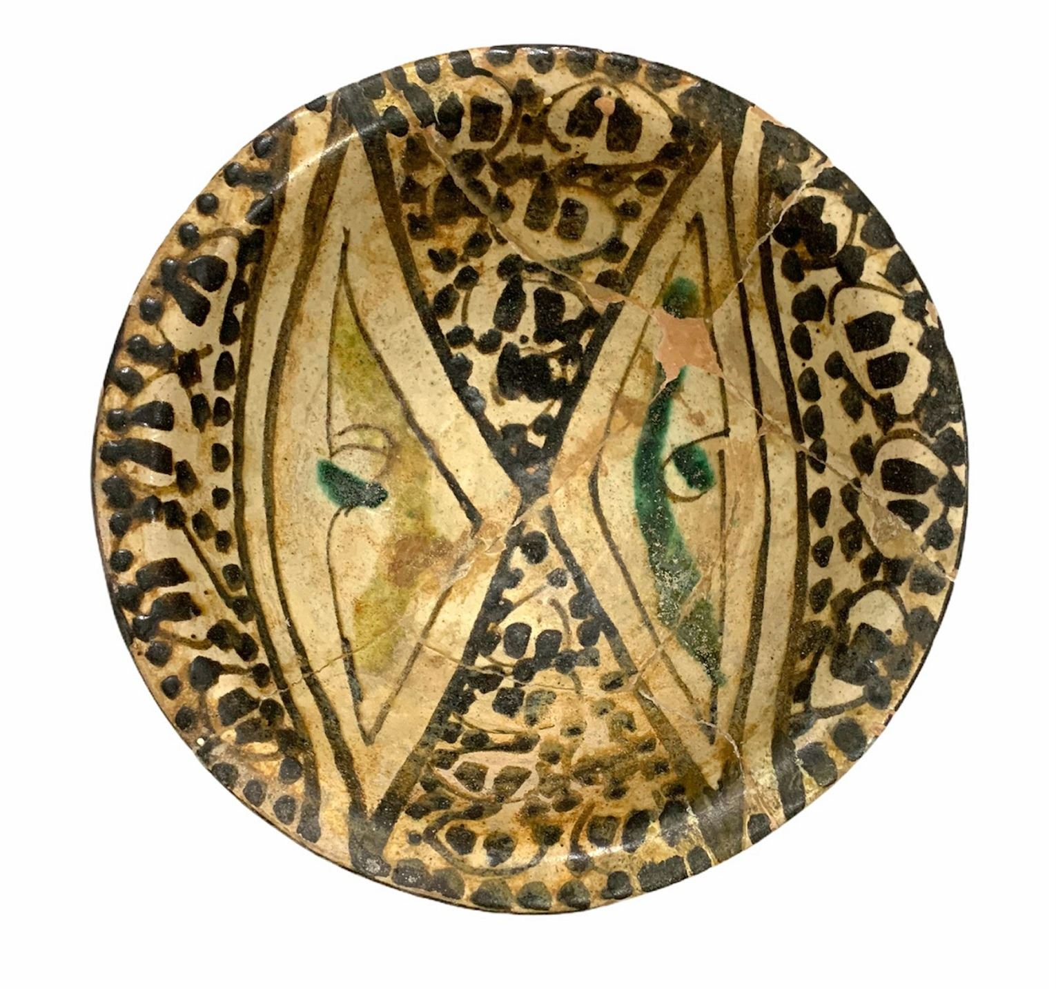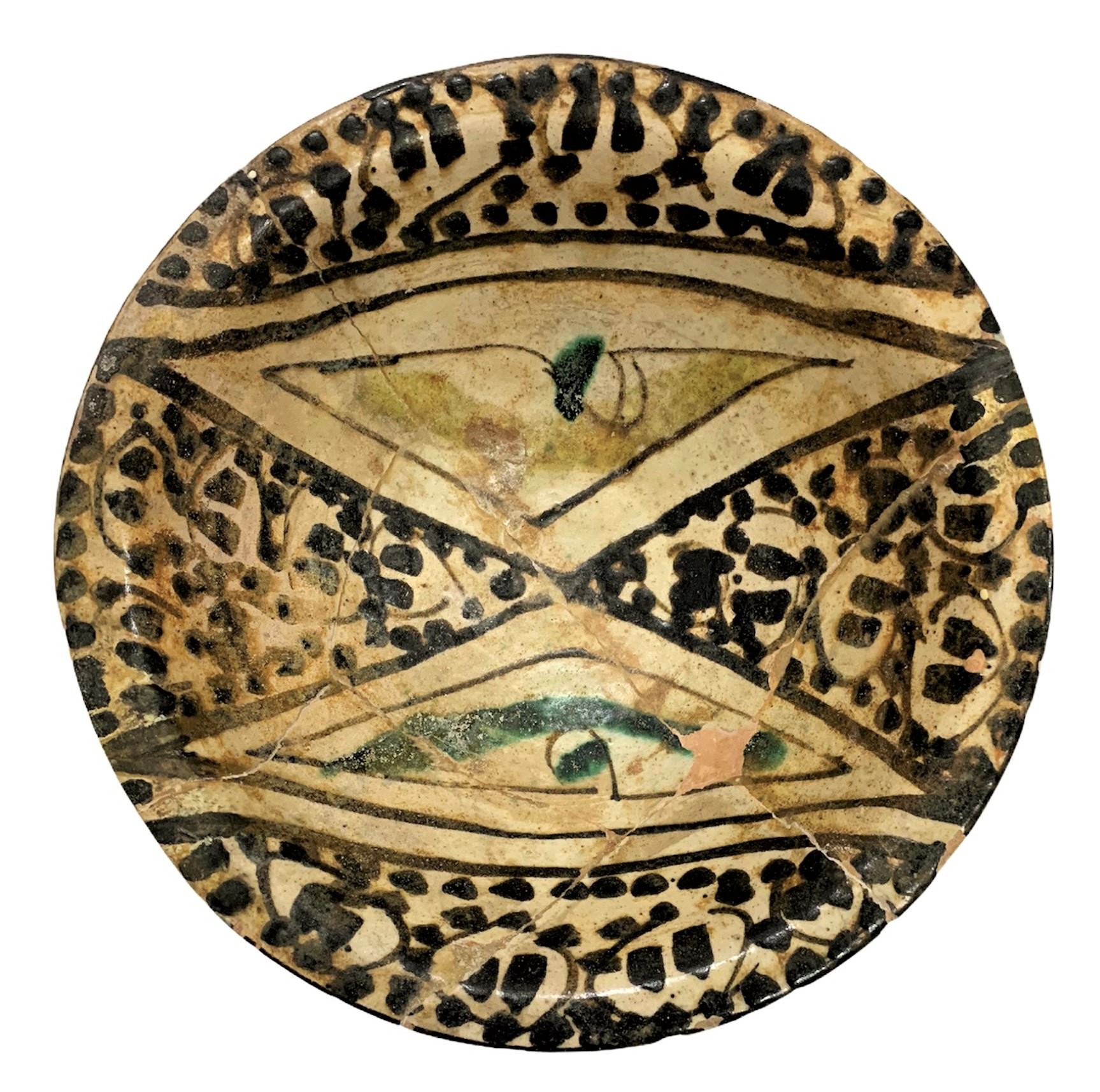 AN UNUSUAL & VERY RARE ANCIENT ISLAMIC ABBASID SLIP-PAINTED & SPLASHED POTTERY 'FLAG' BOWL, CIRCA 9TH CENTURY, Of rounded form with everted lip on short foot, decorated with geometric pattern, decorated in black on a white ground, the field divided into four by an X, each of the segments decorated in black & green & yellow splashes, depicting stylised Flags one in green & other in Yellow and all around decoration in black.