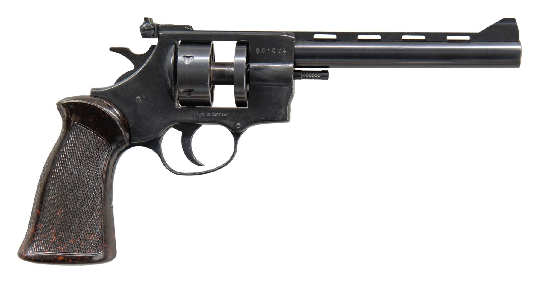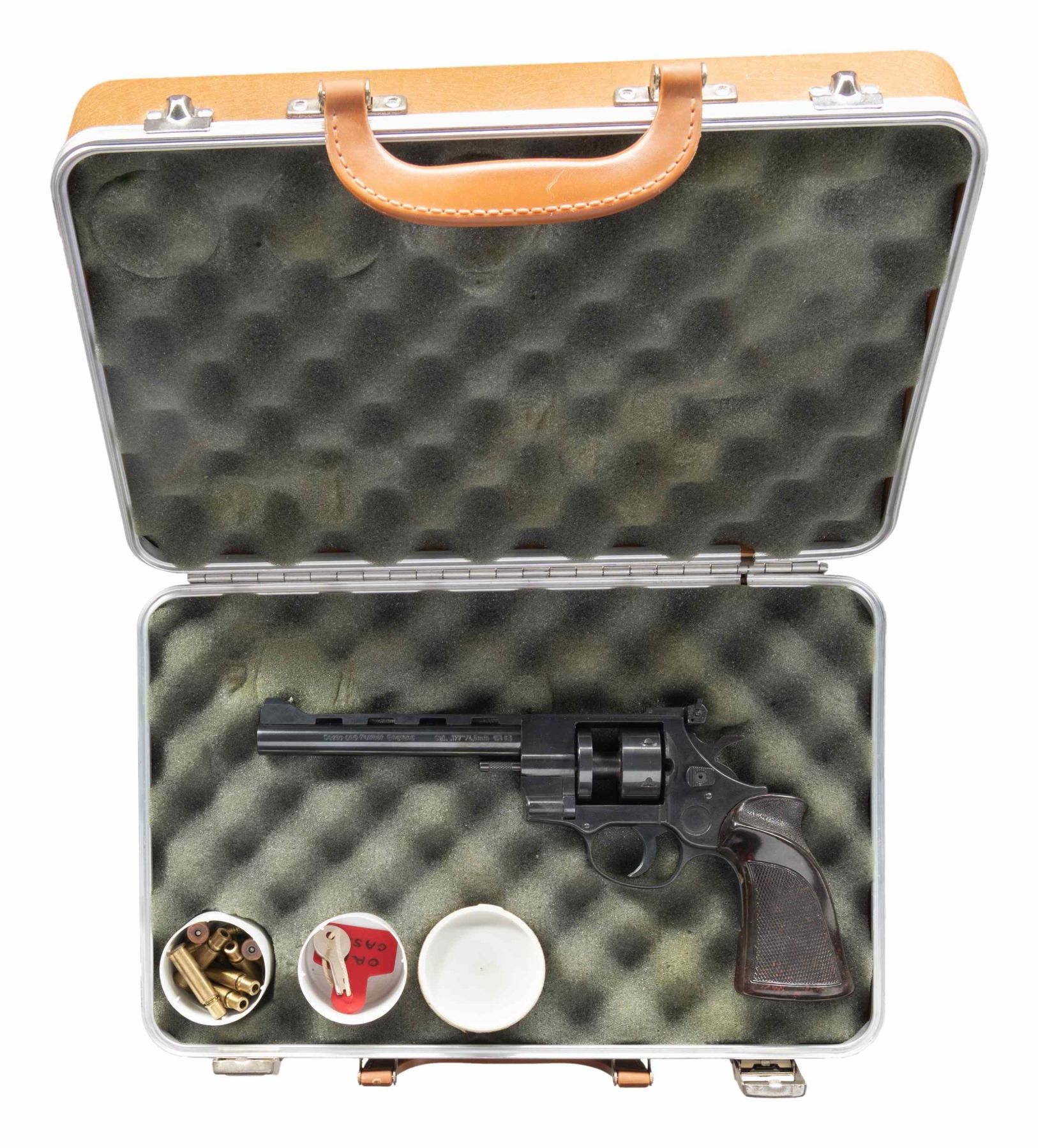REVOLVER WITH CARTRIDGES & CHARGER. Cal. .177. S# 001074. Bbl. 6". Orion double action air cartridge revolver mfg. in Germany and seemingly converted by Saxby & Palmer of England. Left side of the bbl. is marked "Saxby and Palmer England", followed by the cal. designation. Right side of the frame is marked with the S# and "Made in Germany". Alloy frame, steel bbl., steel cyl., and remaining steel parts exhibit a blue finish overall. Frame is mounted with a 1-piece checkered and textured mottled brown synthetic grip. V/R with ramped blade front sight and integral adj. square notch rear sight on frame. UNATTACHED ACCESSORIES: generic hard case containing 12 brass air cartridges. Revolver is also accompanied by a air cartridge charger. CONDITION: metal components retain the vast majority of their original finish, showing some light handling marks, as well as some spots of discoloration on the frame. Mirror bore. Proper manual mechanics. Grip is very good overall. Charger shows some small spots of light surface oxidation / pitting. (02-24388/MLW). NON-GUN. $200-300.