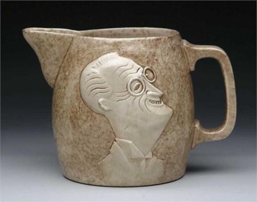 UNUSUAL STANGL POTTERY PITCHER WITH FRANKLIN D. ROOSEVELT PORTRAIT. Light brown mottled pitcher has a relief bust of Franklin and a square saying “Happy Days Are Here Again” on the back. Marked “Stangl 1647-1”. SIZE: 7-1/2” h x 10-1/2” at widest. CONDITION: Some roughness to spout, otherwise very good. 9-27105